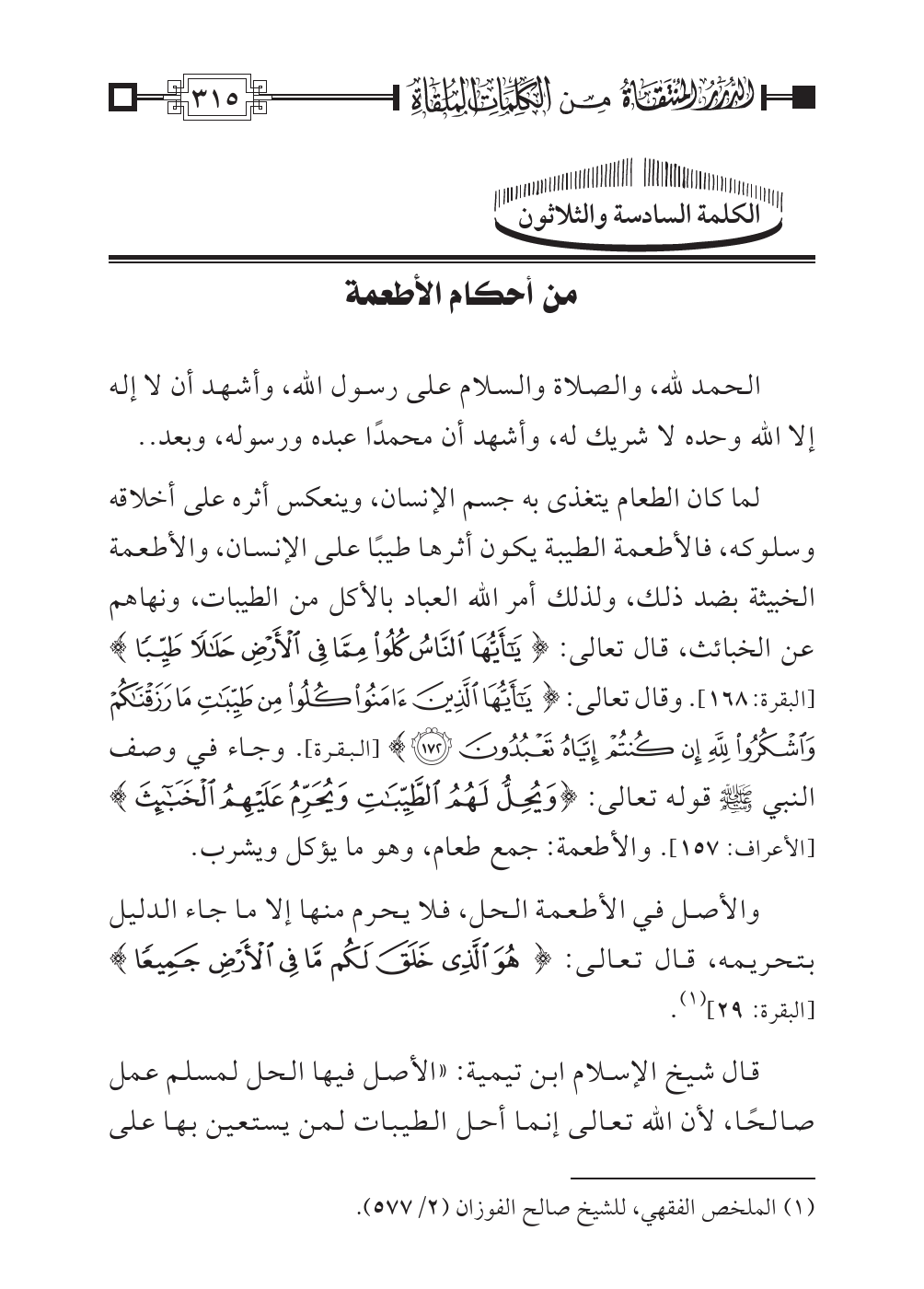 الكلمة السادسة والثلاثون: من أحكام الأطعمة