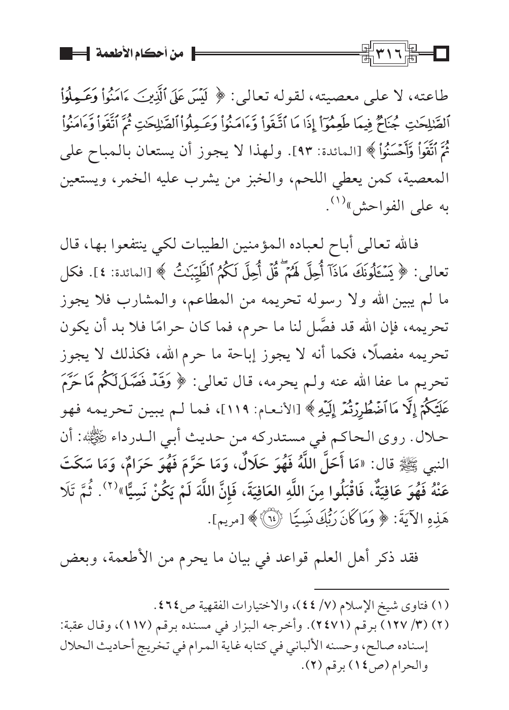 فالله تعالى أباح لعباده المؤمنين الطيبات لكي ينتفعوا بها، قال تعالى: {يَسْأَلُونَكَ مَاذَا أُحِلَّ لَهُمْ قُلْ أُحِلَّ لَكُمُ الطَّيِّبَاتُ} [المائدة: ٤]. فكل ما لم يبين الله ولا رسوله تحريمه من المطاعم، والمشارب فلا يجوز تحريمه، فإن الله قد فصَّل لنا ما حرم، فما كان حرامًا فلا بد أن يكون تحريمه مفصلًا، فكما أنه لا يجوز إباحة ما حرم الله، فكذلك لا يجوز تحريم ما عفا الله عنه ولم يحرمه، قال تعالى: {وَقَدْ فَصَّلَ لَكُم مَّا حَرَّمَ عَلَيْكُمْ إِلَاّ مَا اضْطُرِرْتُمْ إِلَيْهِ} [الأنعام: ١١٩]، فما لم يبين تحريمه فهو حلال. روى الحاكم في مستدركه من حديث أبي الدرداء رضي الله عنه: أن النبي صلى الله عليه وسلم قال: «مَا أَحَلَّ أَحَلَّ اللَّهُ فَهُوَ حَلَالٌ، وَمَا حَرَّمَ فَهُوَ حَرَامٌ، وَمَا سَكَتَ عَنْهُ فَهُوَ عَافِيَةٌ، فَاقْبَلُوا مِنَ اللَّهِ العَافِيَةَ، فَإِنَّ اللَّهَ لَمْ يَكُنْ نَسِيًّا» (¬٢). ثُمَّ تَلَا هَذِهِ الآيَةَ: {وَمَا كَانَ رَبُّكَ نَسِيًّا} [مريم: ٦٤].