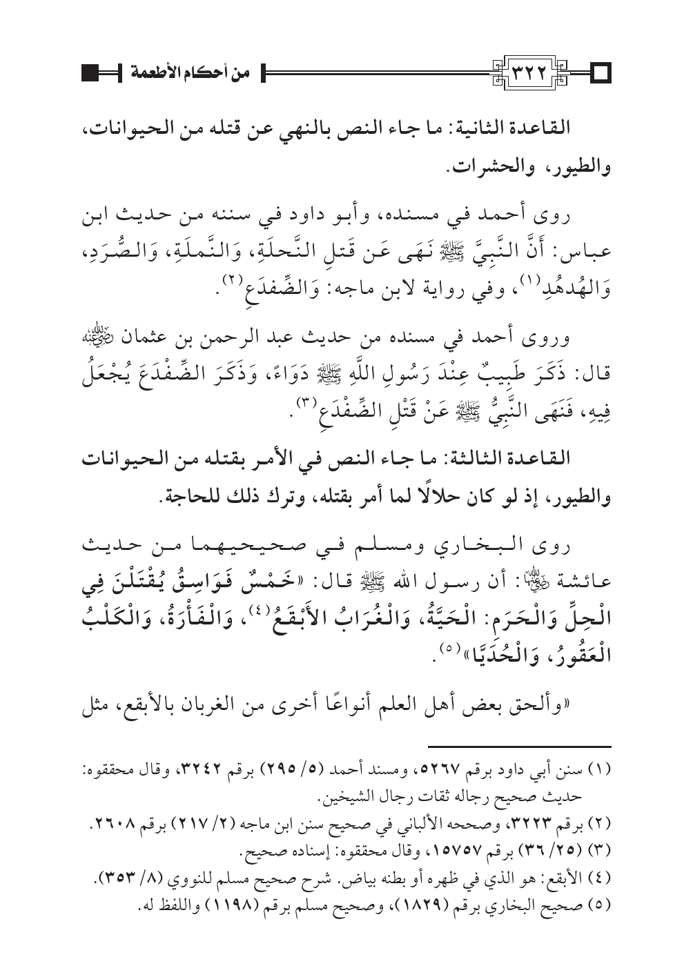 روى أحمد في مسنده، وأبو داود في سننه من حديث ابن عباس: أَنَّ النَّبِيَّ صلى الله عليه وسلم نَهَى عَن قَتلِ النَّحلَةِ، وَالنَّملَةِ، وَالصُّرَدِ، وَالهُدهُدِ (¬١)، وفي رواية لابن ماجه: وَالضِّفدَعِ (¬٢).