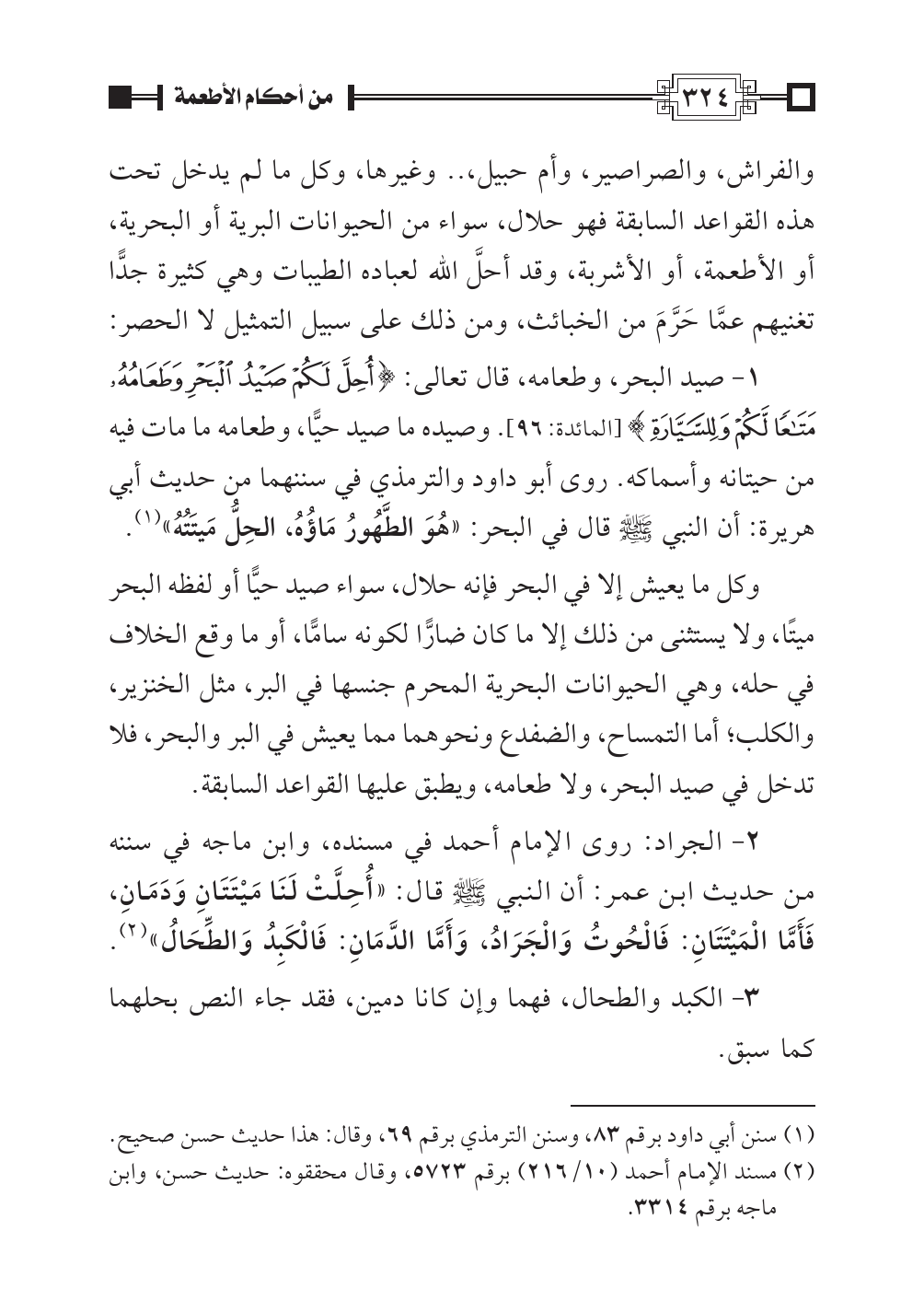 ١ - صيد البحر، وطعامه، قال تعالى: {أُحِلَّ لَكُمْ صَيْدُ الْبَحْرِ وَطَعَامُهُ مَتَاعًا لَّكُمْ وَلِلسَّيَّارَةِ} [المائدة: ٩٦]. وصيده ما صيد حيًّا، وطعامه ما مات فيه من حيتانه وأسماكه. روى أبو داود والترمذي في سننهما من حديث أبي هريرة: أن النبي صلى الله عليه وسلم قال في البحر: «هُوَ الطَّهُورُ مَاؤُهُ، الحِلُّ مَيتَتُهُ» (¬١).
