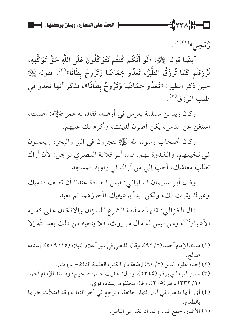 أيضًا قوله صلى الله عليه وسلم: «لَو أَنَّكُم كُنتُم تَتَوَكَّلُونَ عَلَى اللَّهِ حَقَّ تَوَكُّلِهِ، لَرُزِقتُم كَمَا تُرزَقُ الطَّيرُ، تَغدُو خِمَاصًا وَتَرُوحُ بِطَانًا» (¬٣). فقوله صلى الله عليه وسلم حين ذكر الطير: «تَغدُو خِمَاصًا وَتَرُوحُ بِطَانًا»، فذكر أنها تغدو في طلب الرزق (¬٤).