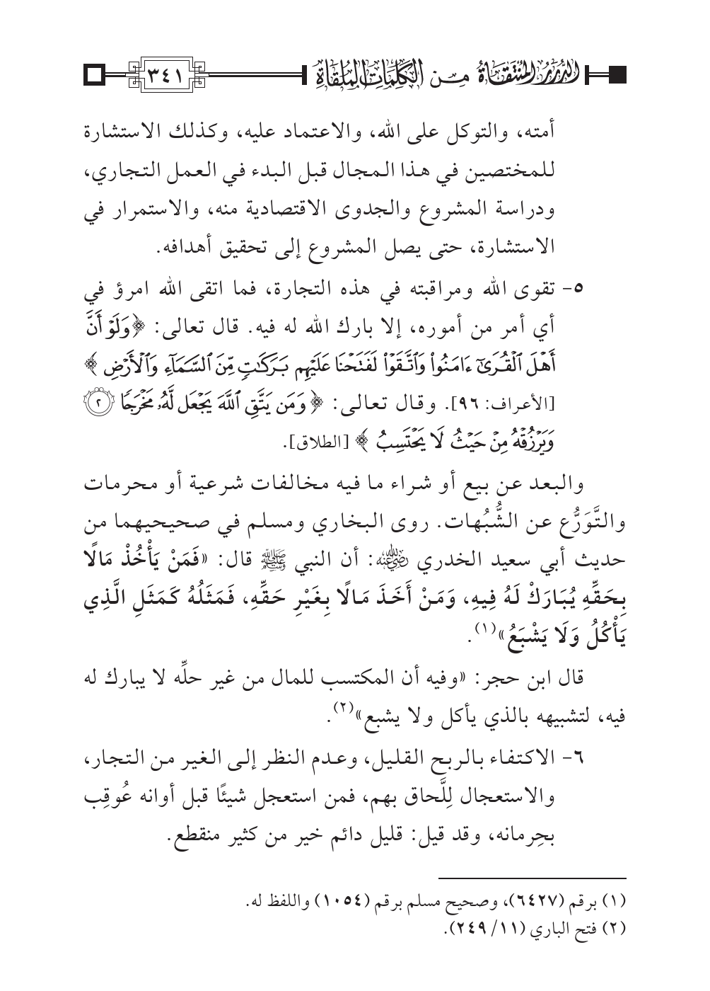 ٦ - الاكتفاء بالربح القليل، وعدم النظر إلى الغير من التجار، والاستعجال لِلَّحاق بهم، فمن استعجل شيئًا قبل أوانه عُوقِب بحِرمانه، وقد قيل: قليل دائم خير من كثير منقطع.