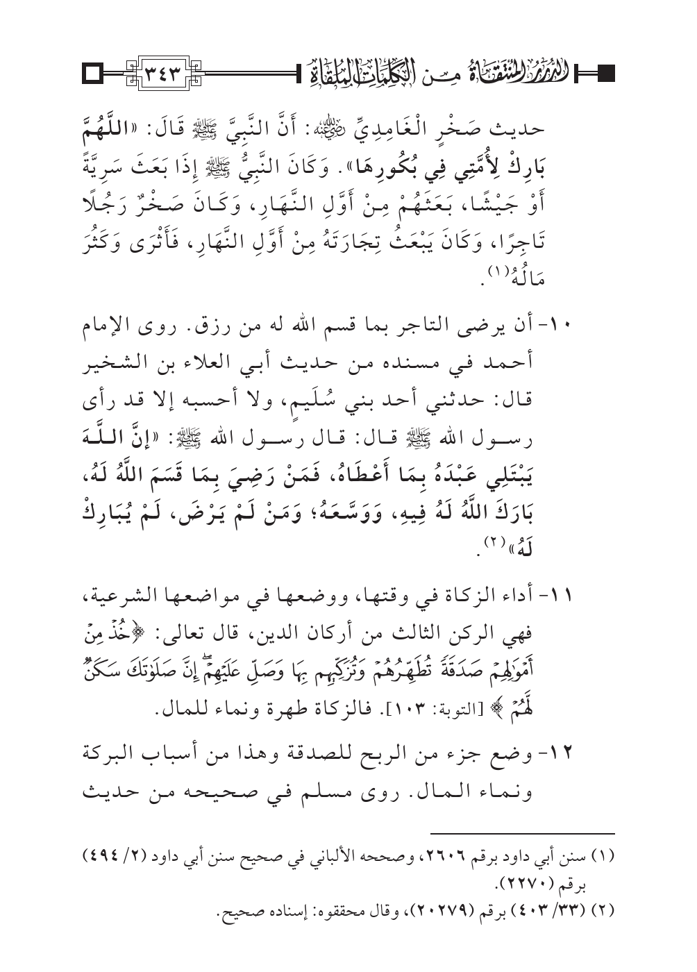 ١٢ - وضع جزء من الربح للصدقة وهذا من أسباب البركة ونماء المال. روى مسلم في صحيحه من حديث