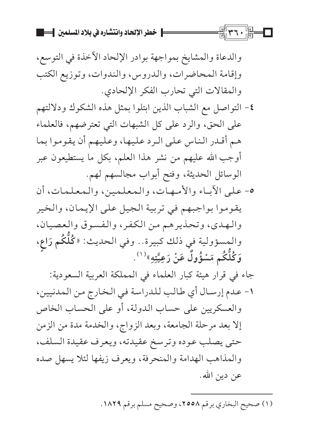 والدعاة والمشايخ بمواجهة بوادر الإلحاد الآخذة في التوسع، وإقامة المحاضرات، والدروس، والندوات، وتوزيع الكتب والمقالات التي تحارب الفكر الإلحادي.