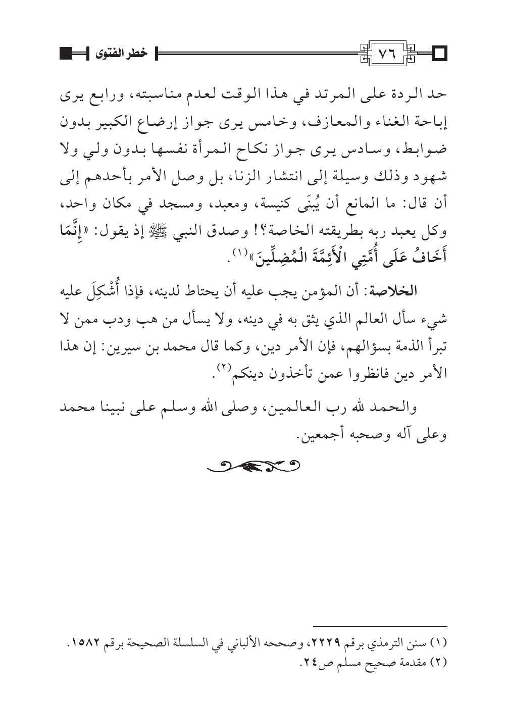حد الردة على المرتد في هذا الوقت لعدم مناسبته، ورابع يرى إباحة الغناء والمعازف، وخامس يرى جواز إرضاع الكبير بدون ضوابط، وسادس يرى جواز نكاح المرأة نفسها بدون ولي ولا شهود وذلك وسيلة إلى انتشار الزنا، بل وصل الأمر بأحدهم إلى أن قال: ما المانع أن يُبنَى كنيسة، ومعبد، ومسجد في مكان واحد، وكل يعبد ربه بطريقته الخاصة؟ ! وصدق النبي صلى الله عليه وسلم إذ يقول: «إِنَّمَا أَخَافُ عَلَى أُمَّتِي الْأَئِمَّةَ الْمُضِلِّينَ» (¬١).