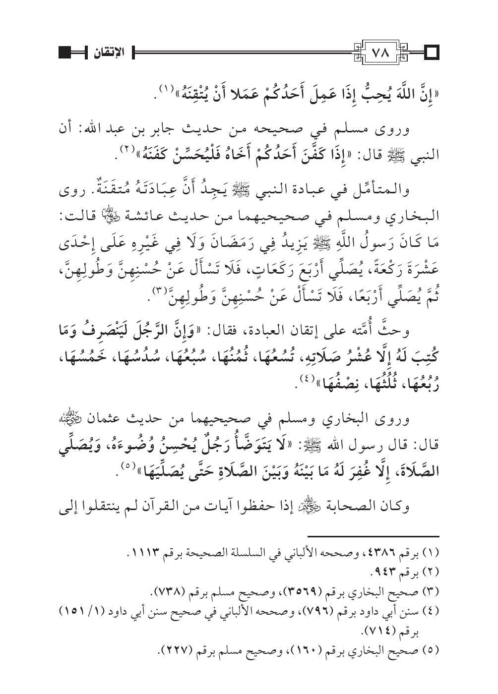 والمتأمِّل في عبادة النبي صلى الله عليه وسلم يَجِدُ أَنَّ عِبَادَتَهُ مُتقَنَةٌ. روى البخاري ومسلم في صحيحيهما من حديث عائشة رضي الله عنها قالت: مَا كَانَ رَسولُ اللَّهِ صلى الله عليه وسلم يَزِيدُ فِي رَمَضَانَ وَلَا فِي غَيْرِهِ عَلَى إِحْدَى عَشْرَةَ رَكْعَةً، يُصَلِّي أَرْبَعَ رَكَعَاتٍ، فَلَا تَسْأَلْ عَنْ حُسْنِهِنَّ وَطُولِهِنَّ، ثُمَّ يُصَلِّي أَرْبَعًا، فَلَا تَسْأَلْ عَنْ حُسْنِهِنَّ وَطُولِهِنَّ (¬٣).
