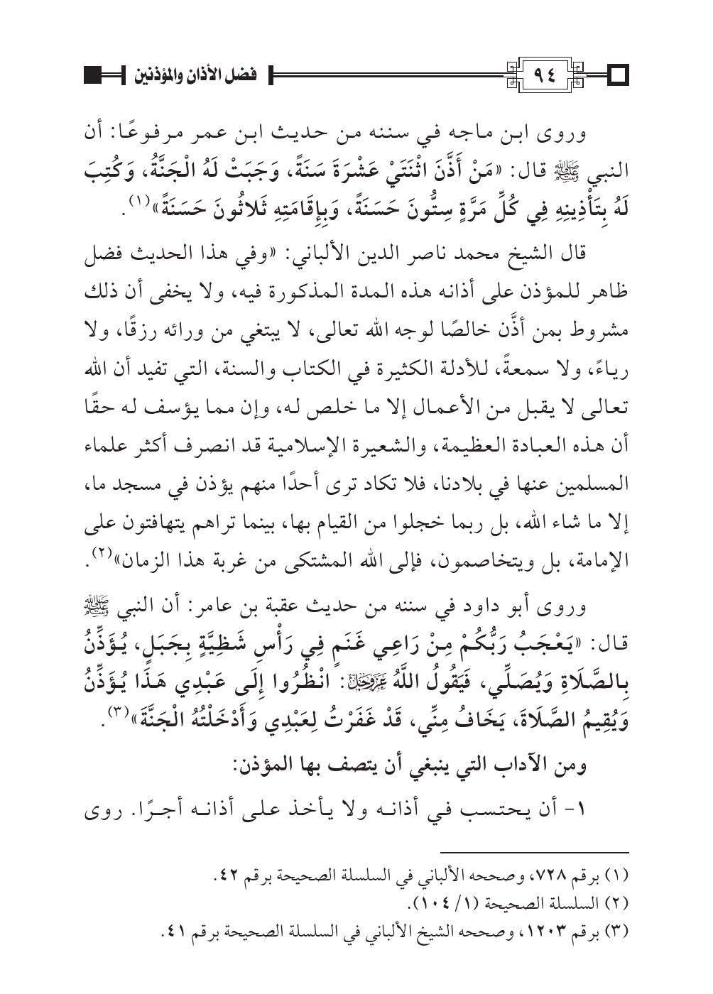 قال الشيخ محمد ناصر الدين الألباني: «وفي هذا الحديث فضل ظاهر للمؤذن على أذانه هذه المدة المذكورة فيه، ولا يخفى أن ذلك مشروط بمن أذَّن خالصًا لوجه الله تعالى، لا يبتغي من ورائه رزقًا، ولا رياءً، ولا سمعةً، للأدلة الكثيرة في الكتاب والسنة، التي تفيد أن الله تعالى لا يقبل من الأعمال إلا ما خلص له، وإن مما يؤسف له حقًا أن هذه العبادة العظيمة، والشعيرة الإسلامية قد انصرف أكثر علماء المسلمين عنها في بلادنا، فلا تكاد ترى أحدًا منهم يؤذن في مسجد ما، إلا ما شاء الله، بل ربما خجلوا من القيام بها، بينما تراهم يتهافتون على الإمامة، بل ويتخاصمون، فإلى الله المشتكى من غربة هذا الزمان» (¬٢).