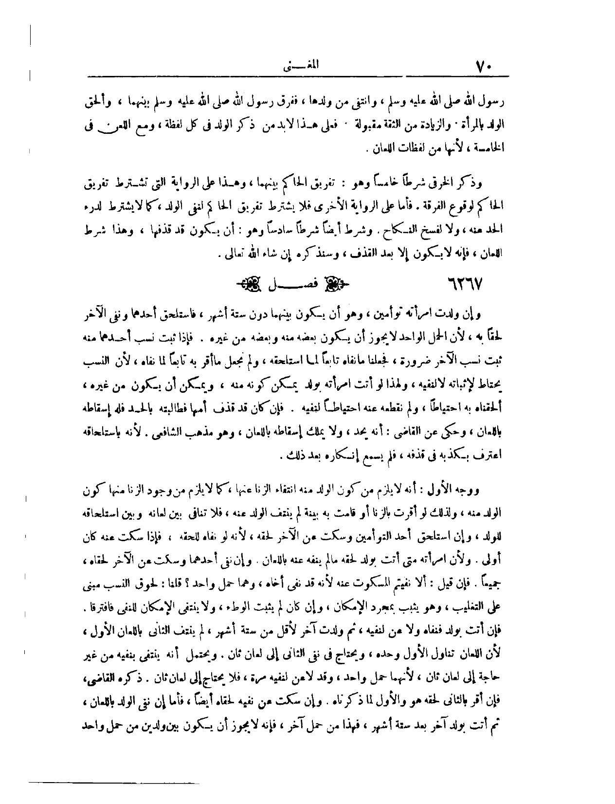 (٦٢٦٨) فَصْلٌ: وَإِنْ وَلَدْت امْرَأَتُهُ تَوْأَمَانٍ، وَهُوَ أَنْ يَكُونَ بَيْنَهُمَا دُونَ سِتَّةِ أَشْهُرٍ. فَاسْتَلْحَقَ أَحَدَهُمَا، وَنَفَى الْآخَرَ، لَحِقَا بِهِ؛ لِأَنَّ الْحَمْلَ الْوَاحِدَ لَا يَجُوزُ أَنْ يَكُونَ بَعْضُهُ مِنْهُ وَبَعْضُهُ مِنْ غَيْرِهِ، فَإِذَا ثَبَتَ نَسَبُ أَحَدِهِمَا مِنْهُ، ثَبَتَ نَسَبُ الْآخَرِ ضَرُورَةً، فَجَعَلْنَا مَا نَفَاهُ تَابِعًا لِمَا اسْتَلْحَقَهُ، وَلَمْ نَجْعَلْ مَا أَقَرَّ بِهِ تَابِعًا لِمَا نَفَاهُ؛ لِأَنَّ النَّسَبَ يُحْتَاطُ لِإِثْبَاتِهِ لَا لِنَفْيِهِ، وَلِهَذَا لَوْ أَتَتْ امْرَأَتُهُ بِوَلَدٍ يُمْكِن كَوْنُهُ مِنْهُ، وَيُمْكِنُ أَنْ يَكُونَ مِنْ غَيْرِهِ، أَلْحَقْنَاهُ بِهِ احْتِيَاطًا، وَلَمْ نَقْطَعْهُ عَنْهُ احْتِيَاطًا لِنَفْيِهِ. فَإِنْ كَانَ قَدْ قَذَفَ أُمَّهُمَا وَطَالَبَتْهُ بِالْحَدِّ، فَلَهُ إسْقَاطُهُ بِاللِّعَانِ. وَحُكِيَ عَنْ الْقَاضِي، أَنَّهُ يُحَدُّ، وَلَا يَمْلِكُ إسْقَاطَهُ بِاللِّعَانِ. وَهُوَ مَذْهَبُ الشَّافِعِيِّ؛ لِأَنَّهُ بِاسْتِلْحَاقِهِ اعْتَرَفَ بِكَذِبِهِ فِي قَذْفِهِ، فَلَمْ يُسْمَعْ إنْكَارُهُ بَعْدَ ذَلِكَ.