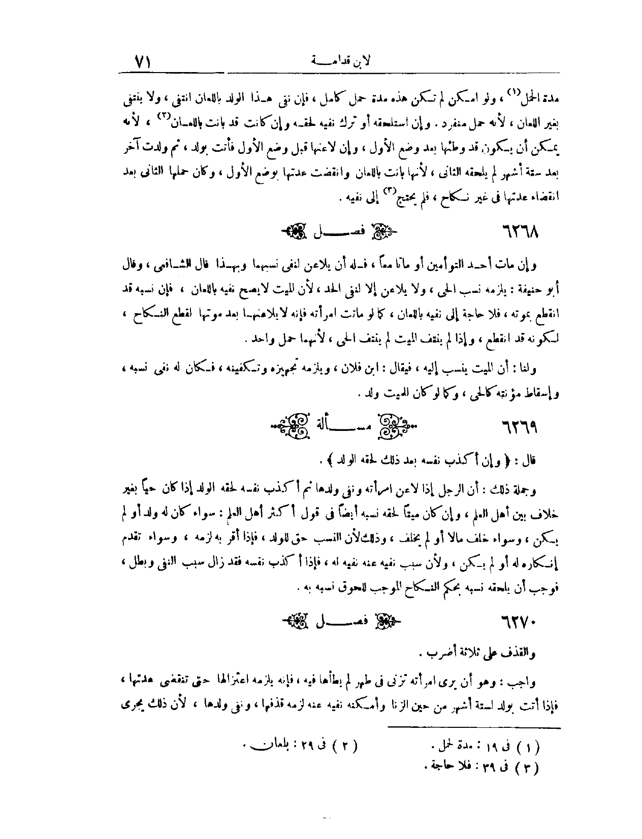 (٦٢٧١) فَصْلٌ: وَالْقَذْفُ عَلَى ثَلَاثَةِ أَضْرُبٍ: وَاجِبٌ، وَهُوَ أَنْ يَرَى امْرَأَتَهُ تَزْنِي فِي طُهْرٍ لَمْ يَطَأْهَا فِيهِ، فَإِنَّهُ يَلْزَمُهُ اعْتِزَالُهَا حَتَّى تَنْقَضِيَ عِدَّتُهَا، فَإِذَا أَتَتْ بِوَلَدٍ لِسِتَّةِ أَشْهُرٍ مِنْ حِينِ الزِّنَا، وَأَمْكَنَهُ نَفْيُهُ عَنْهُ، لَزِمَهُ قَذْفُهَا، وَنَفْيُ وَلَدِهَا؛ لِأَنَّ ذَلِكَ يَجْرِي