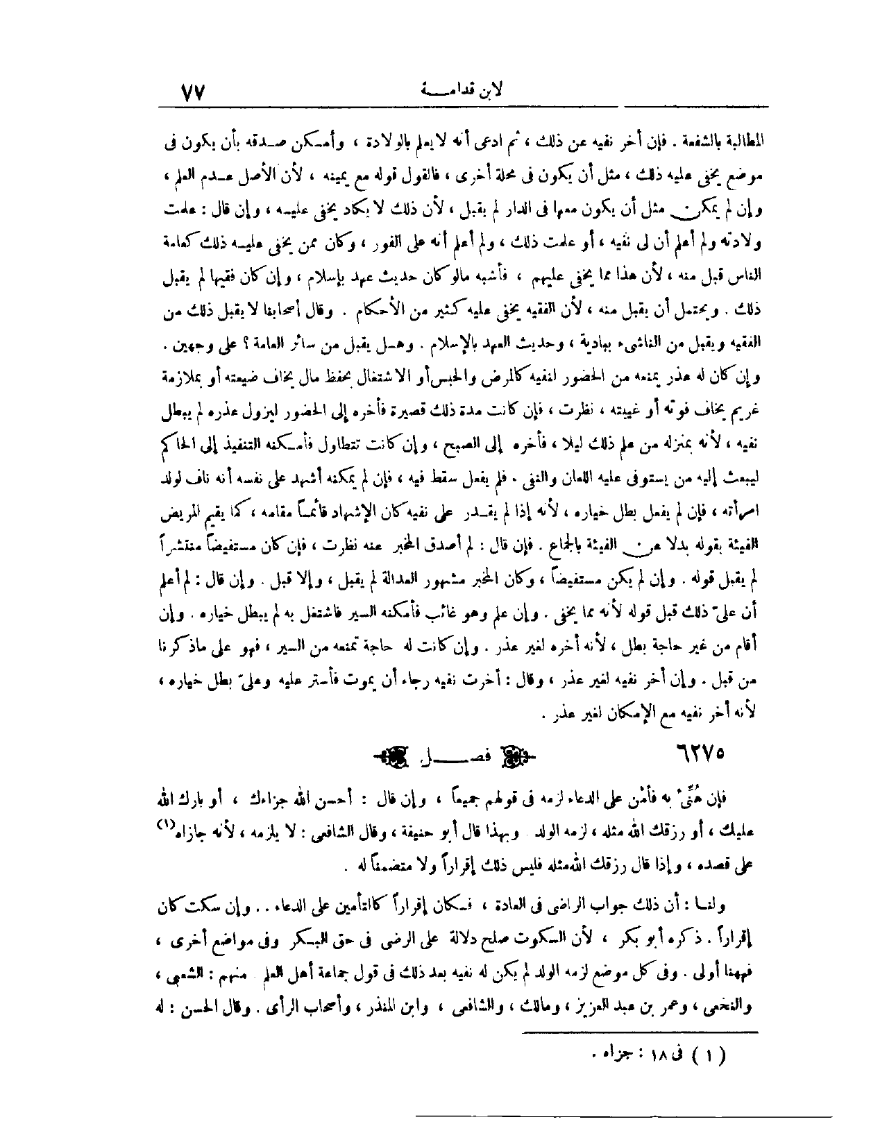 الْمُطَالَبَةِ بِالشُّفْعَةِ، فَإِنْ أَخَّرَ نَفْيَهُ عَنْ ذَلِكَ، ثُمَّ ادَّعَى أَنَّهُ لَا يَعْلَمُ بِالْوِلَادَةِ، وَأَمْكَنَ صِدْقُهُ، بِأَنْ يَكُونَ فِي مَوْضِعٍ يَخْفَى عَلَيْهِ ذَلِكَ، مِثْلُ أَنْ يَكُونَ فِي مَحَلَّةٍ أُخْرَى، فَالْقَوْلُ قَوْلُهُ مَعَ يَمِينِهِ؛ لِأَنَّ الْأَصْلَ عَدَمُ الْعِلْمِ، وَإِنْ لَمْ يُمْكِنْ، مِثْلُ أَنْ يَكُونَ مَعَهَا فِي الدَّارِ، لَمْ يُقْبَلْ؛ لِأَنَّ ذَلِكَ لَا يَكَادُ يَخْفَى عَلَيْهِ. وَإِنْ قَالَ: عَلِمْت وِلَادَتَهُ، وَلَمْ أَعْلَمْ أَنَّ لِي نَفْيَهُ. أَوْ عَلِمْت ذَلِكَ، وَلَمْ أَعْلَمْ أَنَّهُ عَلَى الْفَوْرِ. وَكَانَ مِمَّنْ يَخْفَى عَلَيْهِ ذَلِكَ، كَعَامَّةِ النَّاسِ، قُبِلَ مِنْهُ؛ لِأَنَّ هَذَا مِمَّا يَخْفَى عَلَيْهِمْ، فَأَشْبَهَ مَا لَوْ كَانَ حَدِيثَ عَهْدٍ بِإِسْلَامٍ، وَإِنْ كَانَ فَقِيهًا، لَمْ يُقْبَلْ ذَلِكَ مِنْهُ؛ لِأَنَّهُ مِمَّا لَا يَخْفَى عَلَيْهِ ذَلِكَ. وَيَحْتَمِلُ أَنْ يُقْبَلَ مِنْهُ؛ لِأَنَّ الْفَقِيهَ يَخْفَى عَلَيْهِ كَثِيرٌ مِنْ الْأَحْكَامِ.