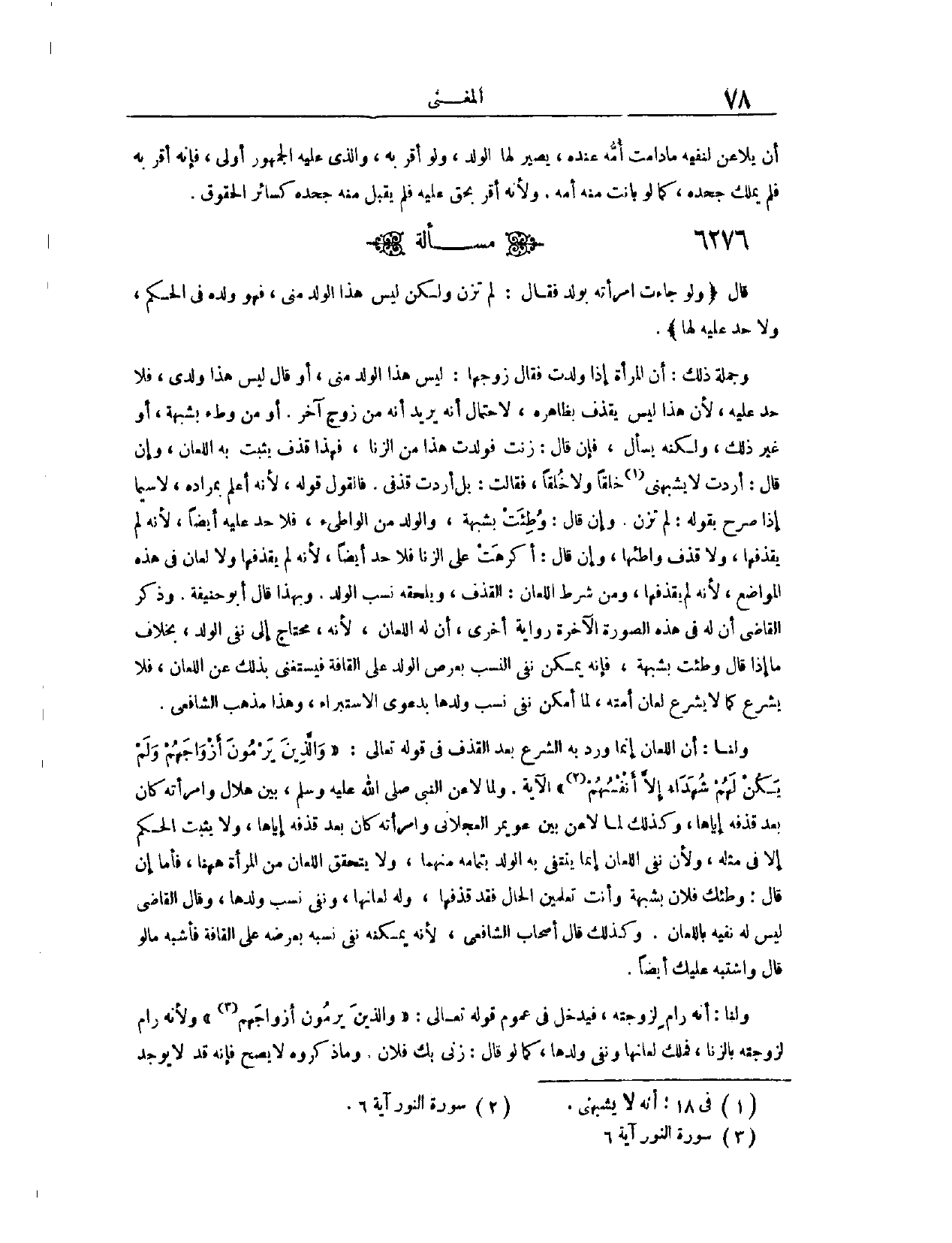 (٦٢٧٧) مَسْأَلَةٌ قَالَ: (وَلَوْ جَاءَتْ امْرَأَتُهُ بِوَلَدٍ، فَقَالَ: لَمْ تَزْنِ، وَلَكِنْ لَيْسَ هَذَا الْوَلَدُ مِنِّي. فَهُوَ وَلَدُهُ فِي الْحُكْمِ، وَلَا حَدَّ عَلَيْهِ لَهَا) وَجُمْلَةُ ذَلِكَ أَنَّ الْمَرْأَةَ إذَا وَلَدَتْ. فَقَالَ زَوْجُهَا: لَيْسَ هَذَا الْوَلَدُ مِنِّي. أَوْ قَالَ لَيْسَ هَذَا وَلَدِي. فَلَا حَدَّ عَلَيْهِ؛ لِأَنَّ هَذَا لَيْسَ بِقَذْفٍ بِظَاهِرِهِ، لِاحْتِمَالِ أَنَّهُ يُرِيدُ أَنَّهُ مِنْ زَوْجٍ آخَرَ، أَوْ مِنْ وَطْءٍ بِشُبْهَةٍ، أَوْ غَيْرِ ذَلِكَ، وَلَكِنَّهُ يُسْأَلُ، فَإِنْ قَالَ: زَنَتْ، فَوَلَدَتْ هَذَا مِنْ الزِّنَا. فَهَذَا قَذْفٌ يَثْبُتُ بِهِ اللِّعَانُ، وَإِنْ قَالَ: أَرَدْت أَنَّهُ لَا يُشْبِهُنِي خَلْقًا وَلَا خُلُقًا. فَقَالَتْ: بَلْ أَرَدْتَ قَذْفِي. فَالْقَوْلُ قَوْلُهُ؛ لِأَنَّهُ أَعْلَمُ بِمُرَادِهِ، لَا سِيَّمَا إذَا صَرَّحَ بِقَوْلِهِ: لَمْ تَزْنِ.