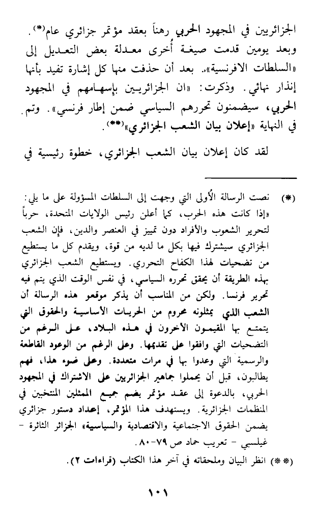 (*) نصت الرسالة الأولى التي وجهت إلى السلطات المسؤولة على ما يلي: (إذا كانت هذه الحرب، كما أعلن رئيس الولايات المتحدة، حربا لتحرير الشعوب والأفراد دون تمييز في العنصر والدين، فإن الشعب الجزائري سيشترك فيها بكل ما لديه من قوة، ويقدم كل ما يستطيع من تضحيات لهذا الكفاح التحرري. ويستطيع الشعب الجزائري بهذه الطريقة أن يحقق تحرره السياسي، في نفس الوقت الذي يتم فيه تحرير فرنسا. ولكن من المناسب أن يذكر موقعو هذه الرسالة أن الشعب الذي يمثلونه محروم من الحريات الأساسية والحقوق التي يتمتع بها المقيمون الآخرون في هذه البلاد، على الرغم من التضحيات التي وافقوا على تقديمها. وعلى الرغم من الوعود القاطعة والرسمية التي وعدوا بها في مرات متعددة. وعلى ضوء هذا، فهم يطالبون، قبل أن يحملوا جماهير الجزائريين على الاشتراك في المجهود الحربي، بالدعوة إلى عقد مؤتمر يضم جميع الممثلين المنتخبين في المنظمات الجزائرية. ويستهدف هذا المؤتمر، إعداد دستور جزائري يضمن الحقوق الاجتماعية والاقتصادية والسياسية) الجزائر الثائرة - غيلسبي - تعريب حماد ص 79 - 80.