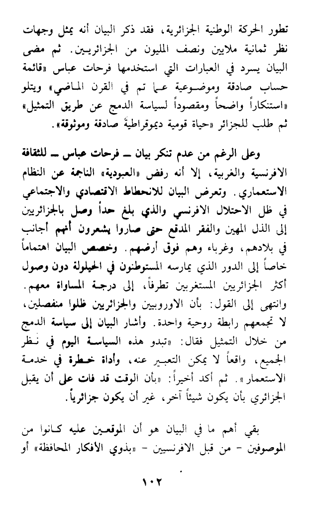 وعلى الرغم من عدم تنكر بيان - فرحات عباس - للثقافة الإفرنسية والغربية، إلا أنه رفض (العبودية) الناجمة عن النظام الاستعماري. وتعرض البيان للانحطاط الاقتصادي والاجتماعي في ظل الاحتلال الإفرنسي والذي بلغ حدا وصل بالجزائريين إلى الذل المهين والفقر المدقع حتى صاروا يشعرون أنهم أجانب في بلادهم، وغرباء وهم فوق أرضهم. وخصص البيان اهتماما خاصا إلى الدور الذي يمارسه المستوطنون في الحيلولة دون وصول أكثر الجزائريين المستغربين تطرفا، إلى درجة المساواة معهم. وانتهى إلى القول: بأن الأوروبيين والجزائريين ظلوا منفصلين، لا تجمعهم رابطة روحية واحدة. وأشار البيان إلى سياسة الدمج من خلال التمثيل فقال: (تبدو هذه السياسة اليوم في نظر الجميع، واقعا لا يمكن التعبير عنه، وأداة خطرة في خدمة الاستعمار). ثم أكد أخيرا: (بأن الوقت قد فات على أن يقبل الجزائري بأن يكون شيئا آخر، غير أن يكون جزائريا.