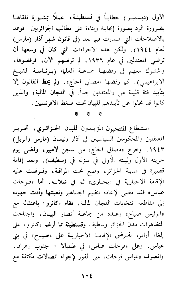 الأول (ديسمبر) خطابا في قسنطينة، عملا بمشورة تلقاها بضرورة الرد بصورة إيجابية وبناءة على مطالب الجزائريين. فوعد بالإصلاحات التي صدرت فيما بعد (في قانون شهر آذار (مارس) لعام 1944). ولكن هذه الإجراءات التي كان في وسعها أن ترضي المعتدلين في عام 1936، لم ترضهم الآن، فرفضوها، واشترك معهم في رفضها جماعة العلماء (برئاسة الشيح الإبراهيمي). كما رفضها (مصالي الحاج). ولم يحظ القانون إلا بتأييد فئة قليلة من (المعتدلين جدا) في اللجان المالية، والذين كانوا قد تخلوا عن تأييدهم للبيان تحت ضغط الإفرنسيين.