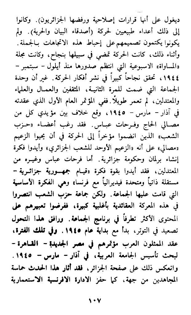 ديغول على أنها قرارات إصلاحية ورفضها الجزائريون). وكانوا إلى ذلك أعداء طبيعيين لحركة (أصدقاء البيان والحرية). ولم يكونوا يكتمون تصميمهم على إحباط هذه الاتجاهات بالجملة. وأثناء ذلك، كانت الحركة تمضي في سبيلها بنجاح، وكانت مجلة (المساواة) الأسبوعية التي انتظم صدورها منذ أيلول - سبتمبر - 1944، تحقق نجاحا كبيرا في نشر أفكار الحركة. غير أن وحدة الجماعة التي ضمت للمرة الثانية، المثقفين والعمال والعلماء والمعتدلين، لم تعمر طويلا. ففي المؤتمر العام الأول الذي عقدته في آذار - مارس - 1945، وقع خلاف بين مؤيدي كل من مصالي الحاج وفرحات عباس. فقد رغب أعضاء (حزب الشعب) الذين انضموا مؤخرا إلى الحركة في أن يحيوا الزعيم (مصالي) على أنه (الزعيم الأوحد للشعب الجزائري) وأيدوا فكرة إنشاء برلمان وحكومة جزائرية. أما فرحات عباس وغيره من المعتدلين، فقد أيدوا بقوة فكرة (قيام جمهورية جزائرية - مستقلة ذاتيا ومتحدة فيديراليا مع فرنسا) وهي الفكرة الأساسية التي قامت عليها الجماعة. ولكن جماعة حزب الشعب انتصروا في هذه المعركة العقائدية بأغلبية كبيرة، ففرضوا تعبيرهم على المحتوى الأكثر تطرفا في برنامج الجماعة. ورافق هذا التحول تصعيد في التوتر، بدأ مع بداية عام 1945. وفي تلك الفترة، عقد الممثلون العرب مؤتمرهم في مصر الجديدة - القاهرة -لبحث تأسيس الجامعة العربية، في آذار - مارس - 1945 وانعكس ذلك على صفحة الجزائر، فقد أثار هذا الحدث حماسة المجاهدين من جهة، كما حفز الإدارة الإفرنسية الاستعمارية