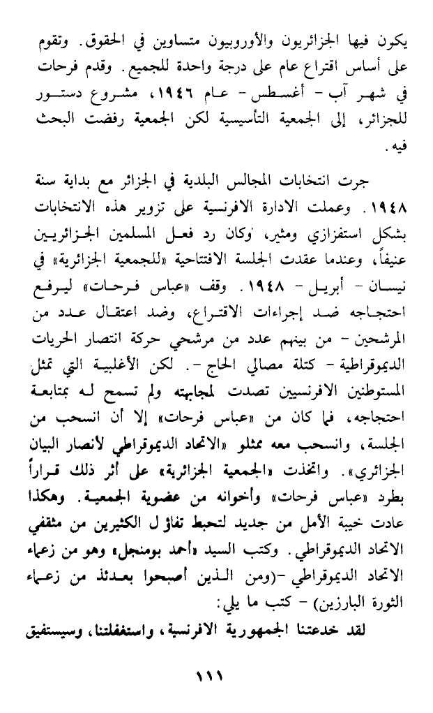 جرت انتخابات المجالس البلدية في الجزائر مع بداية سنة 1948. وعملت الإدارة الإفرنسية على تزوير هذه الانتخابات بشكل استفزازي ومثير، وكان رد فعل المسلمين الجزائريين عنيفا، وعندما عقدت الجلسة الافتتاحية (للجمعية الجزائرية) في نيسان - أبريل - 1948. وقف (عباس فرحات) ليرفع احتجاجه ضد إجراءات الاقتراع، وصضد اعتقال عدد من المرشحين - من بينهم عدد من مرشحي حركة انتصار الحريات الديموقراطية - كتلة مصالي الحاج -. لكن الأغلبية التي تمثل. المستوطنين الإفرنسيين تصدت لمجابهته ولم تسمح له بمتابعة احتجاجه، فما كان من (عباس فرحات) إلا أن انسحب من الجلسة، وانسحب معه ممثلو (الاتحاد الديموقراطي لأنصار البيان الجزائري). واتخذت (الجمعية الجزائرية) على أثر ذلك قرارا بطرد (عباس فرحات) وأخوانه من عضوية الجمعية. وهكذا عادت خيبة الأمل من جديد لتحبط تفاؤل الكثيرين من مثقفي الاتحاد الديموقراطي. وكتب السيد (أحمد بومنجل) وهو من زعماء الاتحاد الديموقراطي - (ومن الذين أصبحوا بعدئذ من زعماء الثورة البارزين) - كتب ما يلي: