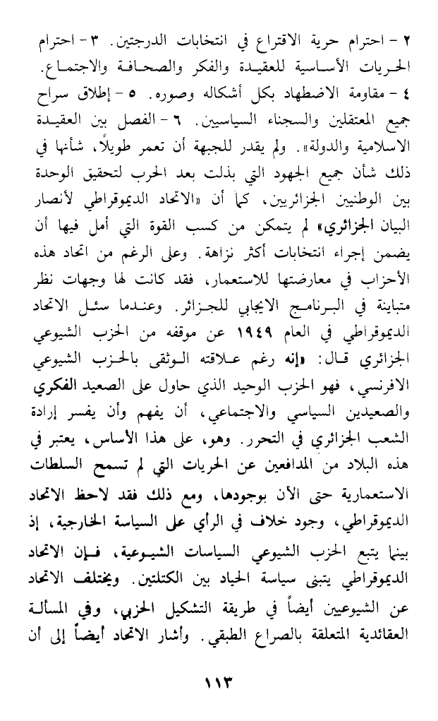 ولم يقدر للجبهة أن تعمر طويلا، شأنها في ذلك شأن جميع الجهود التي بذلت بعد الحرب لتحقيق الوحدة بين الوطنيين الجزائريين، كما أن (الاتحاد الديموقراطي لأنصار البيان الجزائري) لم يتمكن من كسب القوة التي أمل فيها أن يضمن إجراء انتخابات أكثر نزاهة. وعلى الرغم من اتحاد هذه الأحزاب في معارضتها للاستعمار، فقد كانت لها وجهات نظر متباينة في البرنامج الإيجابي للجزائر. وعندما سئل الاتحاد الديموقراطي في العام 1949 عن موقفه من الحزب الشيوعي الجزائري قال: (إنه رغم علاقته الوثقى بالحزب الشيوعي الإفرنسي، فهو الحزب الوحيد الذي حاول على الصعيد الفكري والصعيدين السياسي والاجتماعي، أن يفهم وأن يفسر إرادة الشعب الجزائري في التحرر. وهو، على هذا الأساس، يعتبر في هذه البلاد من المدافعين عن الحريات التي لم تسمح السلطات الاستعمارية حتى الآن بوجودها، ومع ذلك فقد لاحظ الاتحاد الديموقراطي، وجود خلاف في الرأي على السياسة الخارجية، إذ بينما يتبع الحزب الشيوعي السياسات الشيوعية، فإن الاتحاد الديموقراطي يتبنى سياسة الحياد بين الكتلتين. ويختلف الاتحاد عن الشيوعيين أيضا في طريقة التشكيل الحزبي، وفي المسألة العقائدية المتعلقة بالصراع الطبقي. وأشار الاتحاد أيضا إلى أن