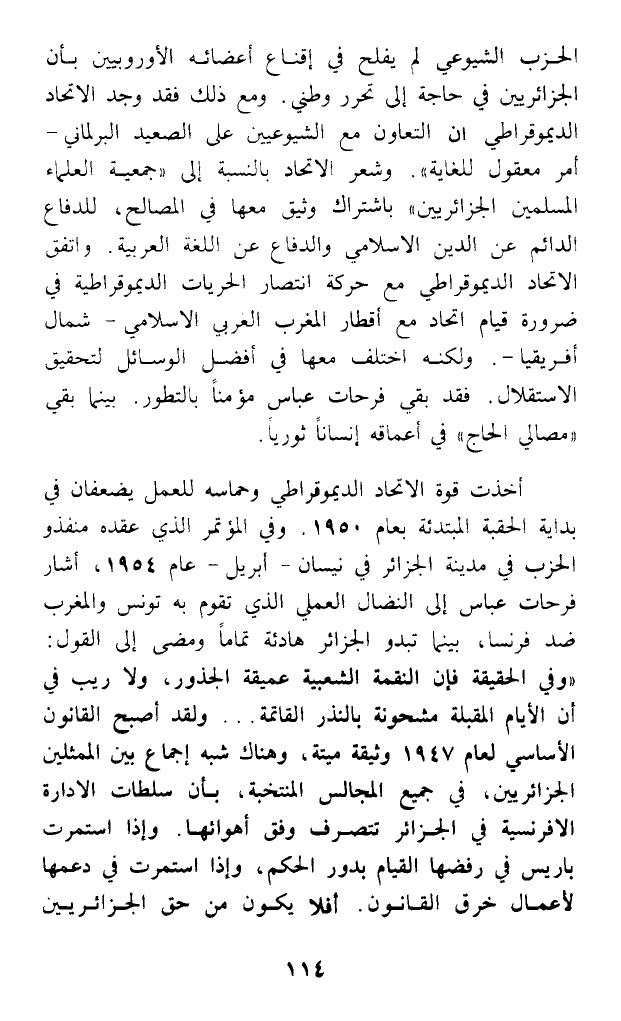 الحزب الشيوعي لم يفلح في إقناع أعضائه الأوروبيين بأن الجزائريين في حاجة إلى تحرر وطني. ومع ذلك فقد وجد الاتحاد الديموقراطي أن التعاون مع الشيوعيين على الصعيد البرلماني - أمر معقول للغاية). وشعر الاتحاد بالنسبة إلى (جمعية العلماء المسلمين الجزائريين) باشتراك وثيق معها في المصالح، للدفاع الدائم عن الدين الإسلامي والدفاع عن اللغة العربية. واتفق الاتحاد الديموقراطي مع حركة انتصار الحريات الديموقراطية في ضرورة قيام اتحاد مع أقطار المغرب العربي الإسلامي - شمال أفريقيا -. ولكنه اختلف معها في أفضل الوسائل لتحقيق الاستقلال. فقد بقي فرحات عباس مؤمنا بالتطور. بينما بقي (مصالي الحاج في أعماقه إنسانا ثوريا.