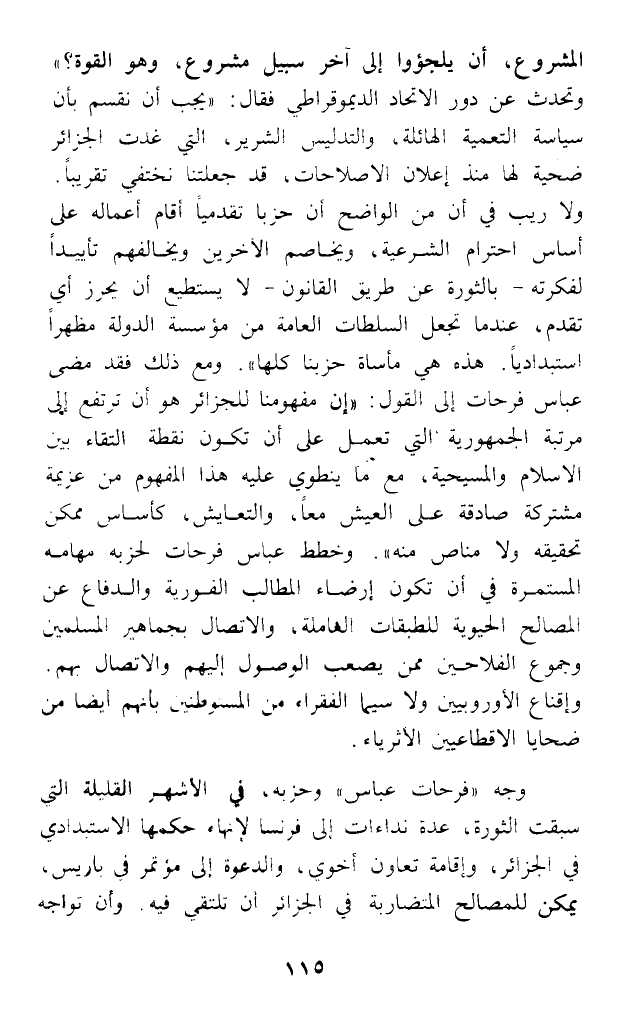 المشروع، أن يلجؤوا إلى آخر سبيل مشروع، وهو القوة؟) وتحدث عن دور الاتحاد الديموقراطي فقال: (يجب أن نقسم بأن سياسة التعمية الهائلة، والتدليس الشرير، التي غدت الجزائر ضحية لها منذ إعلان الإصلاحات، قد جعلتنا نختفي تقريبا. ولا ريب في أن من الواضح أن حزبا تقدميا أقام أعماله على أساس احترام الشرعية، ويخاصم الآخرين ويخالفهم تأييدا لفكرته - بالثورة عن طريق القانون - لا يستطيع أن يحرز أي تقدم، عندما تجعل السلطات العامة من مؤسسة الدولة مظهرا استبداديا. هذه هي مأساة حزبنا كلها). ومع ذلك فقد مضى عباس فرحات إلى القول: (إن مفهومنا للجزائر هو أن ترتفع إلى مرتبة الجمهورية التي تعمل على أن تكون نقطة التقاء بين الاسلام والمسيحية، مع ما ينطوي عليه هذا المفهوم من عزيمة مشتركة صادقة على العيش معا، والتعايش، كأساس ممكن تحقيقه ولا مناص منه). وخطط عباس فرحات لحزبه مهامه المستمرة في أن تكون إرضاء المطالب الفورية والدفاع عن المصالح الحيوية للطبقات العاملة، والاتصال بجماهير المسلمين وجموع الفلاحين ممن يصعب الوصول إليهم والاتصال بهم. وإقناع الأوروبيين ولا سيما الفقراء من المستوطنين بأنهم أيضا من ضحايا الإقطاعيين الأثرياء.