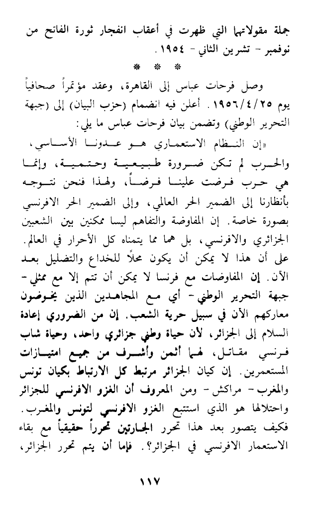 (إن النظام الاستعماري هو عدونا الأساسي، والحرب لم تكن ضرورة طبيعية وحتمية، وإنما هي حرب فرضت علينا فرضا، ولهذا فنحن نتوجه بأنظارنا إلى الضمير الحر العالمي، وإلى الضمير الحر الإفرنسي بصورة خاصة. إن المفاوضة والتفاهم ليسا ممكنين بين الشعبين الجزائري والإفرنسي، بل هما مما يتمناه كل الأحرار في العالم. على أن هذا لا يمكن أن يكون محلا للخداع والتضليل بعد الآن. إن المفاوضات مع فرنسا لا يمكن أن تتم إلا مع ممثلي - جبهة التحرير الوطني - أي مع المجاهدين الذين يخوضون معاركهم الآن في سبيل حرية الشعب. إن من الضروري إعادة السلام إلى الجزائر، لأن حياة وطني جزائري واحد، وحياة شاب فرنسي مقاتل، لهما أثمن وأشرف من جميع امتيازات المستعمرين. إن كيان الجزائر مرتبط كل الارتباط بكيان تونس والمغرب - مراكش - ومن المعروف أن الغزو الإفرنسي للجزائر واحتلالها هو الذي استتبع الغزو الإفرنسي لتونس والمغرب. فكيف يتصور بعد هذا تحرر الجارتين تحررا حقيقيا مع بقاء الاستعمار الإفرنسي في الجزائر؟. فإما أن يتم تحرر الجزائر،