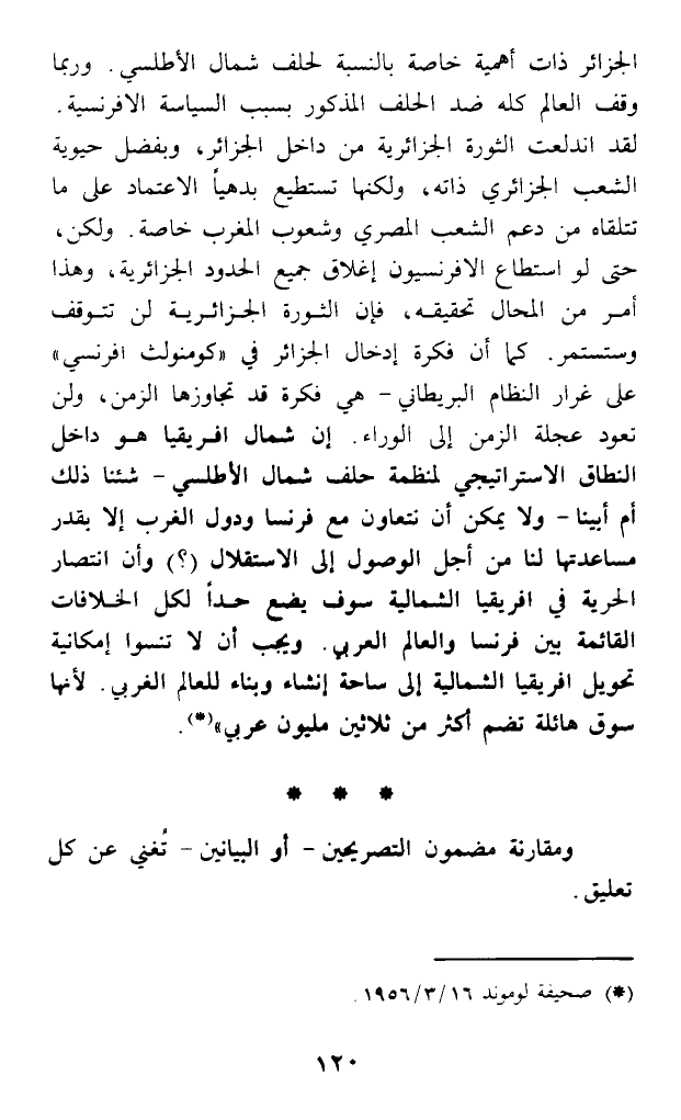 الجزائر ذات أهمية خاصة بالنسبة لحلف شمال الأطلسي. وربما وقف العالم كله ضد الحلف المذكور بسبب السياسة الإفرنسية. لقد اندلعت الثورة الجزائرية من داخل الجزائر، وبفضل حيوية الشعب الجزائري ذاته، ولكنها تستطيع بدهيا الاعتماد على ما تتلقاه من دعم الشعب المصري وشعوب المغرب خاصة. ولكن، حتى لو استطاع الإفرنسيون إغلاق جميع الحدود الجزائرية، وهذا أمر من المحال تحقيقه، فإن الثورة الجزائرية لن تتوقف وستستمر. كما أن فكرة إدخال الجزائر في (كومنولث إفرنسي) على غرار النظام البريطاني - هي فكرة قد تجاوزها الزمن، ولن تعود عجلة الزمن إلى الوراء. إن شمال أفريقيا هو داخل النطاق الاستراتيجي لمنظمة حلف شمال الأطلسي - شئنا ذلك أم أبينا - ولا يمكن أن نتعاون مع فرنسا ودول الغرب إلا بقدر مساعدتها لنا من أجل الوصول إلى الاستقلال (؟) وأن انتصار الحرية في أفريقيا الشمالية سوف يضع حدا لكل الخلافات القائمة بين فرنسا والعالم العربي. ويجب أن لا تنسوا إمكانية تحويل أفريقيا الشمالية إلى ساحة إنشاء وبناء للعالم الغربي. لأنها سوق هائلة تضم أكثر من ثلاثين مليون عربي) (*).