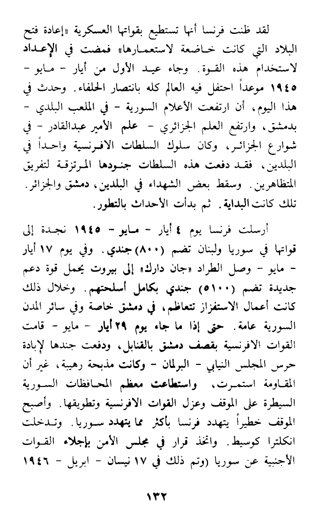 لقد ظنت فرنسا أنها تستطيع بقواتها العسكرية (إعادة فتح البلاد التي كانت خاضعة لاستعمارها) فمضت في الإعداد لاستخدام هذه القوة. وجاء عيد الأول من أيار - مايو - 1945 موعدا احتفل فيه العالم كله بانتصار الحلفاء. وحدث في هذا اليوم، أن ارتفعت الأعلام السورية - في الملعب البلدي - بدمشق، وارتفع العلم الجزائري - علم الأمير عبد القادر - في شوارع الجزائر، وكان سلوك السلطات الإفرنسية واحدا في البلدين، فقد دفعت هذه السلطات جنودها المرتزقة لتفريق المتظاهرين. وسقط بعض الشهداء في البلدين، دمشق والجزائر. تلك كانت البداية. ثم بدأت الأحداث بالتطور.