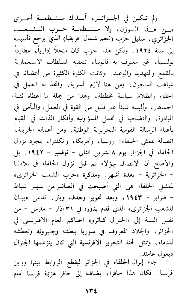ولم تكن في الجزائر، آنذاك منظمة أخرى من هذا الوزن، إلا منظمة حزب الشعب الجزائري، سليل حزب (نجم شمال أفريقيا) الذي يرجع تأسيسه إلى سنة 1924. ولكن هذا الحزب كان منحلا إداريا، مطاردا بوليسيا، غير معترف به قانونيا، تتعقبه السلطات الاستعمارية بالقمع والتهديد والوعيد. وكانت الكثرة الكثيرة من أعضائه في غياهب السجون، ومن هنا لازم السرية، واتخذ له العمل في الخفاء والظلام سياسة مخططة، وهذا من حملة ما أعطاه ثقة. الجماهير، وألبسه شيئا غير قليل من القوة في العمل، والبأس في المبادرة، والتضحية في تحمل المسؤولية وأفكار الذات في القيام بأعباء الرسالة القومية التحريرية الوطنية) ومن أعماله الجريئة، اتصاله بممثلي الحلفاء: روسيا، وأمريكا، وإنكلترا، بمجرد نزول الحلفاء في الجزائر يوم 8 تشرين الثاني - نوفمبر - 1942. بل والأصح أن الاتصال بهؤلاء تم قبل نزول الحلفاء في بلادنا - الجزائرية - بعدة أشهر. ومذكرة (حزب الشعب الجزائري) لممثلي الحلفاء هي التي أصبحت في العاشر من شهر شباط - فبراير - 1943، وبعد تحوير وحذف وبتر، تدعى (بيان للشعب الجزائري) الذي قدم بدوره في 31 آذار - مارس - من نفس السنة إلى (الجنرال كاترو) االحاكم العام الإفرنسي في الجزائر، والجلاد المعروف في سوريا ببطشه وجبروته وتعطشه للدماء، وممثل لجنة التحرير الإفرنسية التي كان يتزعمها الجنرال ديغول عامئذ.