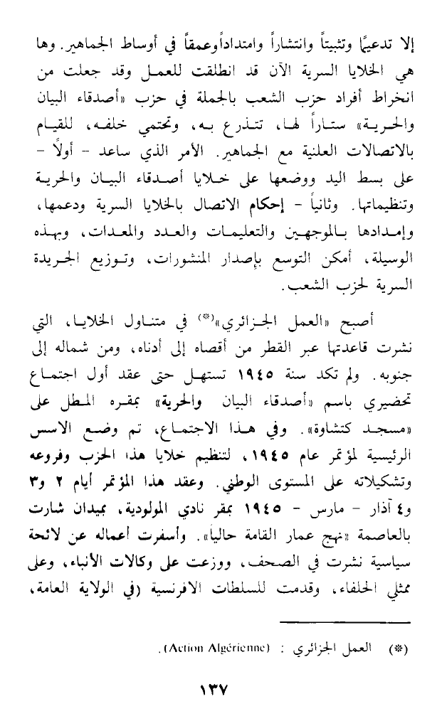 أصبح (العمل الجزائري). (*) في متناول الخلايا، التي نشرت قاعدتها عبر القطر من أقصاه إلى أدناه، ومن شماله إلى جنوبه. ولم تكد سنة 1945 تستهل حتى عقد أول اجتماع تحضيري باسم (أصدقاء البيان والحرية) بمقره المطل على (مسجد كتشاوة). وفي هذا الاجتماع، تم وضع الأسس الرئيسية لمؤتمر عام 1945، لتنظيم خلايا هذا الحزب وفروعه وتشكيلاته على المستوى الوطني. وعقد هذا المؤتمر أيام 2 و3 و4 آذار - مارس - 1945 بمقر نادي المولودية، بميدان شارت بالعاصمة (نهج عمار القامة حاليا). وأسفرت أعماله عن لائحة سياسية نشرت في الصحف، ووزعت على وكالات الأنباء، وعلى ممثلي الحلفاء، وقدمت للسلطات الإفرنسية (في الولاية العامة،