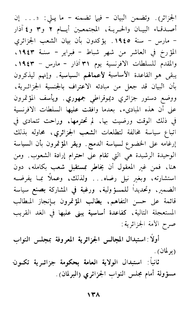 الجزائر). وتضمن البيان - فيما تضمنه - ما يلي: (... إن أصدقاء البيان والحرية، المجتمعين أيام 2 و3 و4 آذار - مارس - سنة 1945. يؤكدون بأن بيان الشعب الجزائري المؤرخ في العاشر من شهر شباط - فبراير - سنة 1943، والمقدم للسلطات الإفرنسية يوم 31 آذار - مارس - 1943، يبقى هو القاعدة الأساسية لأعمالهم السياسية. وإنهم ليذكرون بأن البيان قد جعل من مبادئه الاعتراف بالجنسية الجزائرية، ووضع دستور جزائري ديموقراطي جمهوري. ويأسف المؤتمرون على أن هذه المبادىء، بعدما وافقت عليها السلطات الإفرنسية في ذلك الوقت ورطبت بها، لم تحترمها، وراحت تتمادى في اتباع سياسة مخالفة لتطلعات الشعب الجزائري، محاولة بذلك إرغامه على الخضوع لسياسة الدمج. ويقر المؤتمرون بأن السياسة الوحيدة الرشيدة هي التي تقام على احترام إرادة الشعوب. ومن هنا، فمن غير المعقول أن يخاطر بمستقبل شعب بكامله، دون استشارته، وبغير نيل رضاه ... ولذلك، وعملا بما يفرضه الضمير، وتحديدا للمسؤولية، ورغبة في المشاركة بصنع سياسة قائمة على حسن التفاهم، يطالب المؤتمرون بإنجاز المطالب المستعجلة التالية، كقاعدة أساسية يبنى عليها في الغد القريب صرح الأمة الجزائرية: