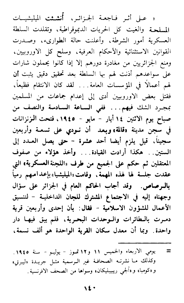(على أثر فاجعة الجزائر، أنشئت الميليشيات المسلحة وألغيت كل الحريات الديمرقراطية، وتقلدت السلطة العسكرية أمور الشرطة، وأعلنت حالة الطوارىء، وصدرت القوانين الاستثنائية والأحكام العرفية، وسلح كل الأوروبيين، ومنع الجزائريين من مغادرة دورهم إلا إذا كانوا يحملون شارات على سواعدهم أذنت لهم بها السلطة بعد تحقيق دقيق يثبت أن لهم أعمالا في المؤسسات العامة ... لقد كان الانتقام فظيعا، فقتل بعض الأوروبيين أدى إلى إعدام جماعات من المسلمين بمجرد الشك فيهم ... ففي الساعة السادسة والنصف من صباح يوم الإثنين 14 أيار - مايو - 1945، فتحت الزنزانات في سجن مدينة (قالما) وبعد أن نودي على تسعة وأربعين سجينا، قيل يلزم أيضا أحد عشرة - حتى يصل العدد إلى الستين .. هكذا أرادت القيادة ... وأخذ هؤلاء من صفوف المعتقلين ثم حكم على الجميع من طرف (اللجنة العسكرية) التي عقدت جلسة لها لهذه المهمة، وقامت (الميليشيا) بإعدامهم رميا بالرصاص. وقد أجاب الحاكم العام في الجزائر على سؤال وجهناه إليه في الاجتماع المشترك للجان الداخلية - لتنسيق الأعمال للشؤون الإسلامية - فقال: بأن إحدى وأربعين قرية دمرت بالطائرات والوحدات البحرية، فلم يبق فيها دار واحدة. وبما أن معدل سكان القرية الواحدة هو ألف نسمة،