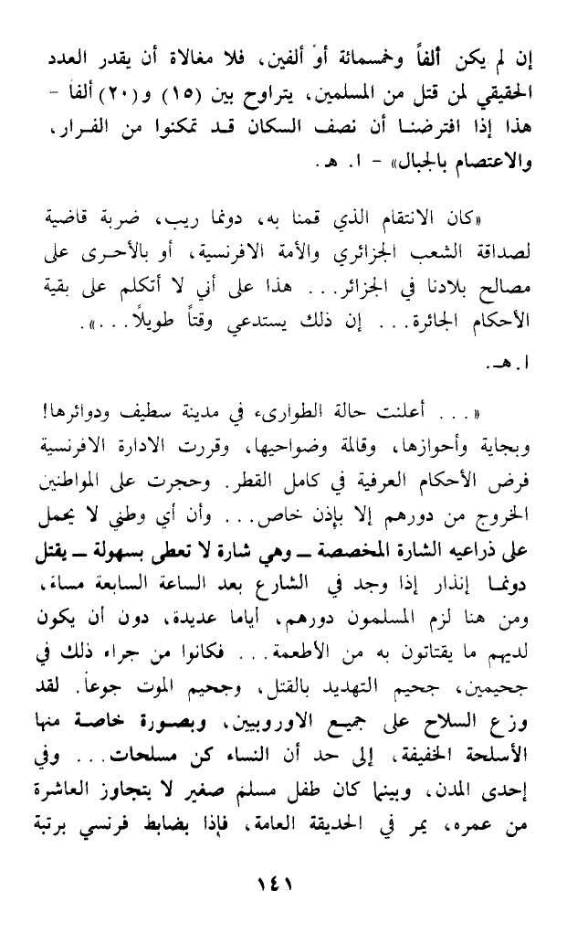 (... أعلنت حالة الطوارىء في مدينة سطيف ودوائرها! وبجاية وأحوازها، وقالمة وضواحيها، وقررت الإدارة الإفرنسية فرض الأحكام العرفية في كامل القطر. وحجرت على المواطنين الخروج من دورهم إلا بإذن خاص ... وأن أي وطني لا يحمل على ذراعيه الشارة المخصصة - وهي شارة لا تعطى بسهولة - يقتل دونما إنذار إذا وجد في الشارع بعد الساعة السابعة مساء، ومن هنا لزم المسلمون دورهم، أياما عديدة، دون أن يكون لديهم ما يقتاتون به من الأطعمة ... فكانوا من جراء ذلك في جحيمين، جحيم التهديد بالقتل، وجحيم الموت جوعا. لقد وزع السلاح على جميع الأوروبيين، وبصورة خاصة منها الأسلحة الخفيفة، إلى حد أن النساء كن مسلحات ... وفي إحدى المدن، وبينما كان طفل مسلم صغير لا يتجاوز العاشرة من عمره، يمر في الحديقة العامة، فإذا بضابط فرنسي برتبة