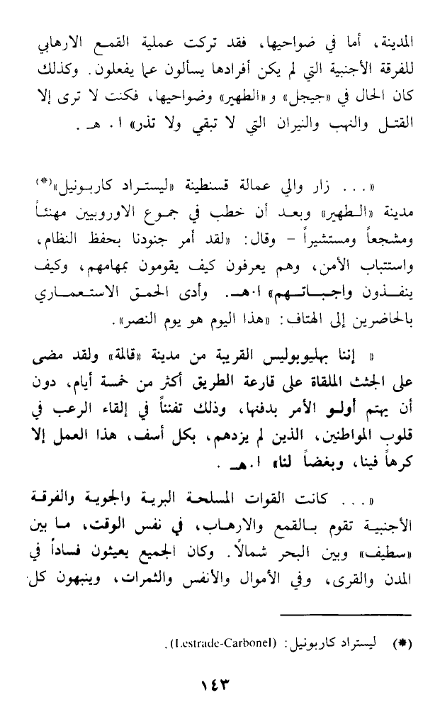 (... زار والي عمالة قسنطينة (ليستراد كاربونيل) (*) مدينة (الطهير) وبعد أن خطب في جموع الأوروبيين مهنئا ومشجعا ومستشيرا - وقال: (لقد أمر جنودنا بحفظ النظام، واستتباب الأمن، وهم يعرفون كيف يقومون بمهامهم، وكيف ينفذون واجباتهم) ا. هـ. وأدى الحمق الاستعماري بالحاضرين إلى الهتاف: (هذا اليوم هو يوم النصر).