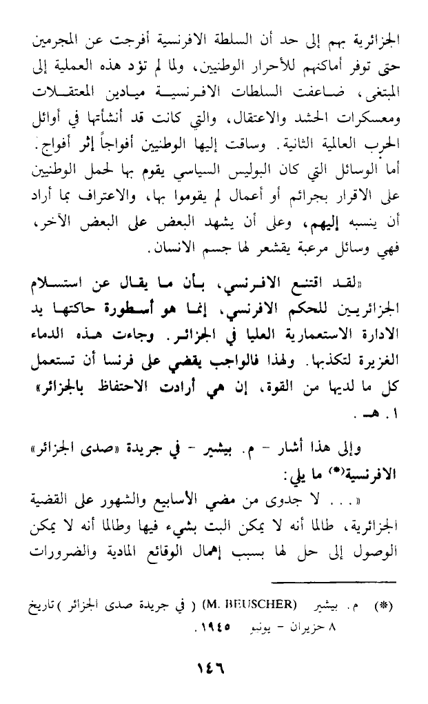 (*) م. بيشير (M.BEUSCHER) (في جريدة صدى الجزائر) تاريخ 8 حزيران - يونيو 1945.