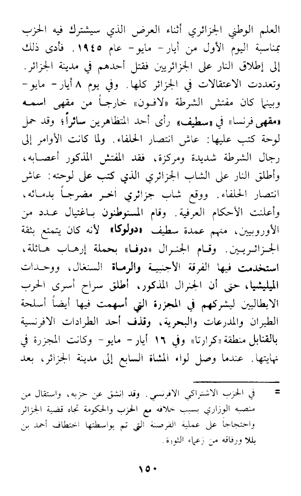 العلم الوطني الجزائري أثناء العرض الذي سيشترك فيه الحزب بمناسبة اليوم الأول من أيار - مايو - عام 1945. فأدى ذلك إلى إطلاق النار على الجزائريين فقتل أحدهم في مدينة الجزائر. وتعددت الاعتقالات في الجزائر كلها. وفي يوم 8 أيار - مايو - وبينما كان مفتش الشرطة (لافون) خارجا من مقهى اسمه (مقهى فرنسا) في (سطيف) رأى أحد المتظاهرين سائرا؛ وقد حمل لوحة كتب عليها: عاش انتصار الحلفاء. ولما كانت الأوامر إلى رجال الشرطة شديدة ومركزة، فقد المفتش المذكور أعصابه، وأطلق النار على الشاب الجزائري الذي كتب على لوحته: عاش انتصار الحلفاء. ووقع شاب جزائري آخر مضرجا بدمائه، وأعلنت الأحكام العرفية. وقام المستوطنون باغتيال عدد من الأوروبيين، منهم عمدة سطيف (دولوكا) لأنه كان يتمتع بثقة الجزائريين. وقام الجنرال (دوفا) بحملة إرهاب هائلة، استخدمت فيها الفرقة الأجنبية والرماة السنغال، ووحدات الميليشيا، حتى أن الجنرال المذكور، أطلق سراح أسرى الحرب الإيطاليين ليشركهم في المجزرة التي أسهمت فيها أيضا أسلحة الطيران والمدرعات والبحرية، وقذف أحد الطرادات الإفرنسية بالقنابل منطقة (كرارتا) وفي 16 أيار - مايو - وكانت المجزرة في نهايتها. عندما وصل لواء المشاة السابع إلى مدينة الجزائر، بعد