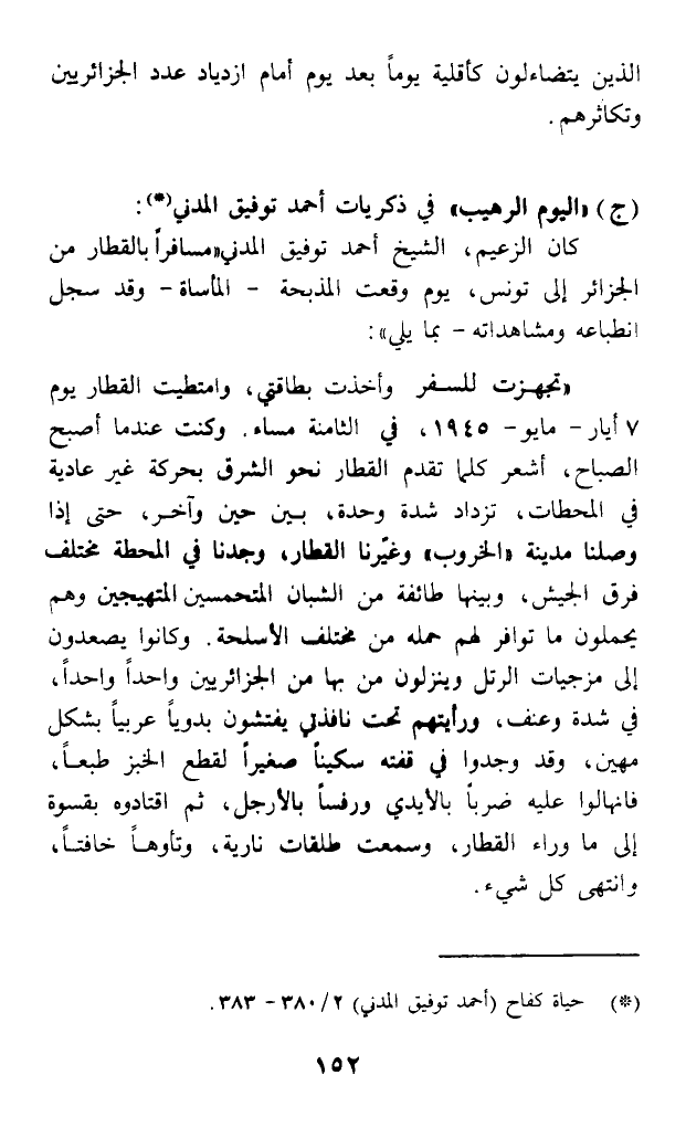 (تجهزت للسفر وأخذت بطاقتي، وامتطيت القطار يوم 7 أيار - مايو - 1945، في الثامنة مساء. وكنت عندما أصبح الصباح، أشعر كلما تقدم القطار نحو الشرق بحركة غير عادية في المحطات، تزداد شدة وحدة، بين حين وآخر، حتى إذا وصلنا مدينة (الخروب) وغيرنا القطار، وجدنا في المحطة مختلف فرق الجيش، وبينها طائفة من الشبان المتحمسين المتهيجين وهم يحملون ما توافر لهم حمله من مختلف الأسلحة. وكانوا يصعدون إلى مزجيات الرتل وينزلون من بها من الجزائريين واحدا واحدا، في شدة وعنف، ورأيتهم تحت نافذتي يفتشون بدويا عربيا بشكل مهين، وقد وجدوا في قفته سكينا صغيرا لقطع الخبز طبعا، فانهالوا عليه ضربا بالأيدي ورفسا بالأرجل، ثم اقتادوه بقوة إلى ما وراء القطار، وسمعت طلقات نارية، وتأوها خافتا، وانتهى كل شيء.