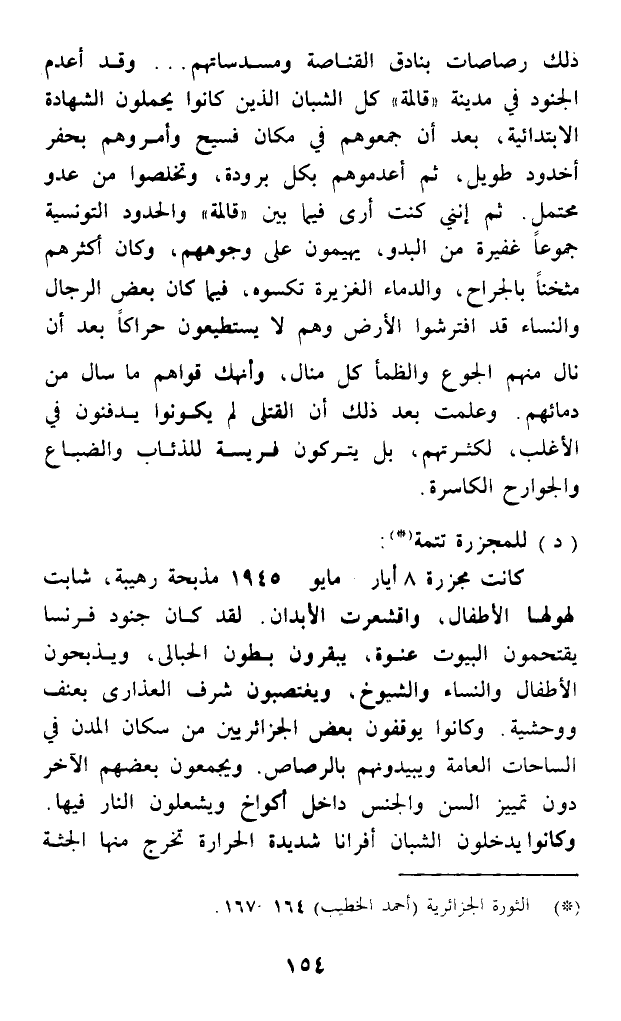 ذلك رصاصات بنادق القناصة ومسدساتهم ... وقد أعدم الجنود في مدينة (قالمة) كل الشبان الذين كانوا يحملون الشهادة الابتدائية، بعد أن جمعوهم في مكان فسيح وأمروهم بحفر أخدود طويل، ثم أعدموهم بكل برودة، وتخلصوا من عدو محتمل. ثم إنني كنت أرى فيما بين (قالمة) والحدود التونسية جموعا غفيرة من البدو، يهيمون على وجوههم، وكان أكثرهم مثخنا بالجراح، والدماء الغزيرة تكسوه، فيما كان بعض الرجال والنساء قد افترشوا الأرض وهم لا يستطيعون حراكا بعد أن نال منهم الجوع والظمأ كل منال، وأنهك قواهم ما سال من دمائهم. وعلمت بعد ذلك أن القتلى لم يكونوا يدفنون في الأغلب، لكثرتهم، بل يتركون فريسة للذئاب والضباع والجوارح الكاسرة.