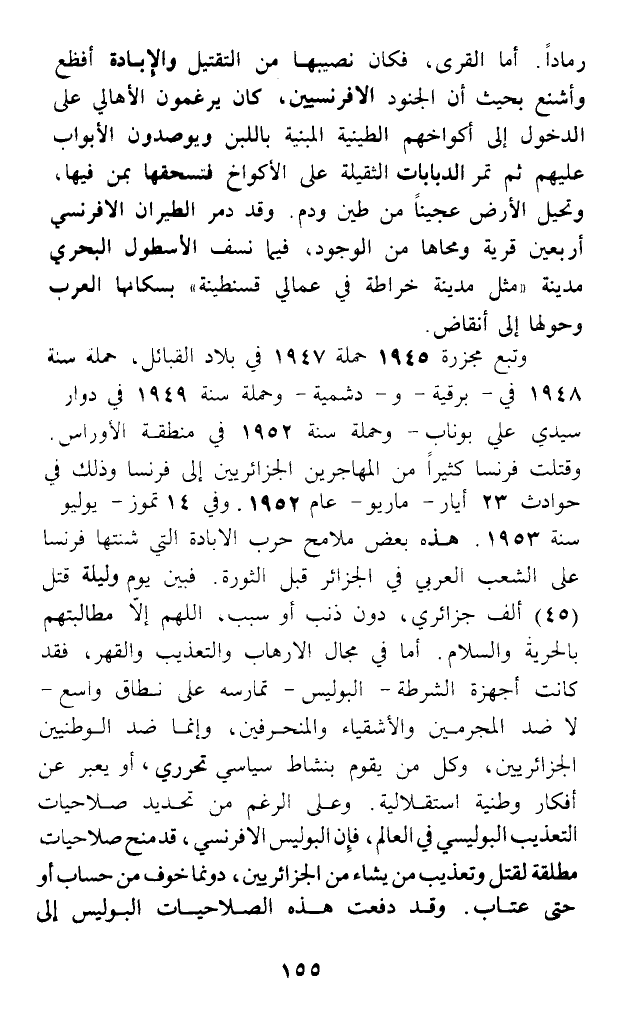 على الشعب العربي في الجزائر قبل الثورة. فبين يوم وليلة قتل (45) ألف جزائري، دون ذنب أو سبب، اللهم إلا مطالبتهم بالحرية والسلام. أما في مجال الإرهاب والتعذيب والقهر، فقد كانت أجهزة الشرطة - البوليس - تمارسه على نطاق واسع - لا ضد المجرمين والأشقياء والمنحرفين، وإنما ضد الوطنيين الجزائريين، وكل من يقوم بنشاط سياسي تحرري، أو يعبر عن أفكار وطنية استقلالية. وعلى الرغم من تحديد صلاحيات التعذيب البوليسي في العالم، فإن البوليس الإفرنسي، قد منح صلاحيات مطلقة لقتل وتعذيب من يشاء من الجزائريين، دونما خوف من حساب أو حتى عتاب. وقد دفعت هذه الصلاحيات البوليس إلى
