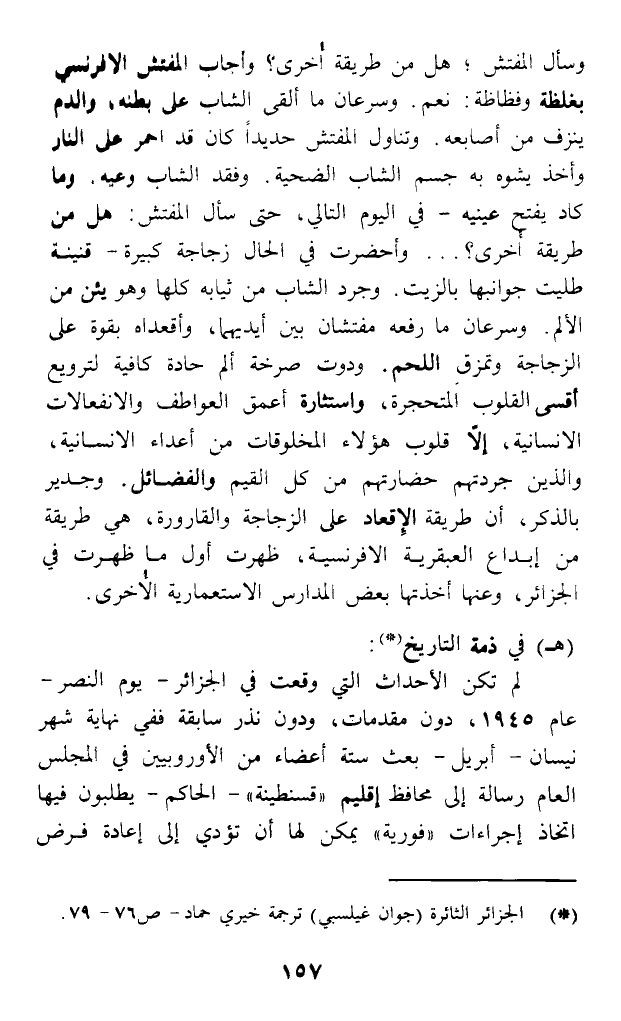 وسأل المفتش؛ هل من طريقة أخرى؟ وأجاب المفتش الإفرنسي بغلظة وفظاظة: نعم. وسرعان ما ألقى الشاب على بطنه، والدم ينزف من أصابعه. وتناول المفتش حديدا كان قد احمر على النار وأخذ يشوه به جسم الشاب الضحية. وفقد الشاب وعيه، وما كاد يفتح عينيه - في اليوم التالي، حتى سأل المفش: هل من طريقة أخرى؟ ... وأحضرت في الحال زجاجة كبيرة - قنينة طليت جوانبها بالزيت. وجرد الشاب من ثيابه كلها وهو يئن من الألم. وسرعان ما رفعه مفتشان بين أيديهما، وأقعداه بقوة على الزجاجة وتمزق اللحم. ودوت صرخة ألم حادة كافية لترويع أقسى القلوب المتحجرة، واستثارة أعمق العواطف والانفعالات الإنسانية، إلا قلوب هؤلاء المخلوقات من أعداء الإنسانية، والذين جردتهم حضارتهم من كل القيم والفضائل. وجدير بالذكر، أن طريقة الإقعاد على الزجاجة والقارورة، هي طريقة من إبداع العبقرية الإفرنسية، ظهرت أول ما ظهرت في الجزائر، وعنها أخذتها بعض المدارس الاستعمارية الأخرى.