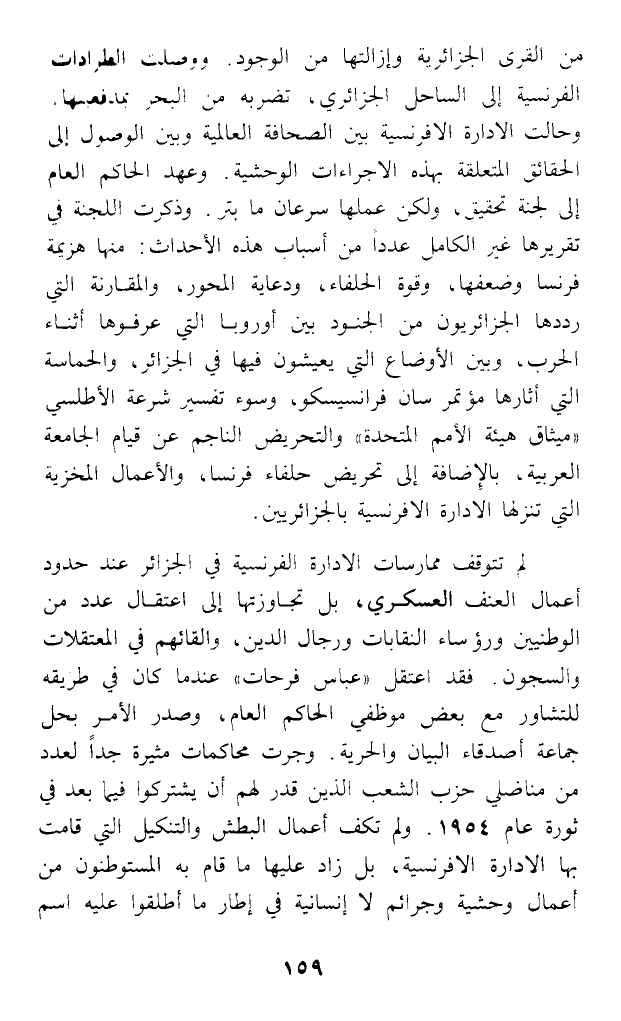 من القرى الجزائرية وإزالتها من الوجود. ووصلت الطرادات الفرنسية إلى الساحل الجزائري، تضربه من البحر بمدفعيتها. وحالت الإدارة الإفرنسية بين الصحافة العالمية وبين الوصول إلى الحقائق المتعلقة بهذه الإجراءات الوحشية. وعهد الحاكم العام إلى لجنة تحقيق، ولكن عملها سرعان ما بتر. وذكرت اللجنة في تقريرها غير الكامل عددا من أسباب هذه الأحداث: منها هزيمة فرنسا وضعقها، وقوة الحلفاء، ودعاية المحور، والمقارنة التي رددها الجزائريون من الجنود بين أوروبا التي عرفوها أثناء الحرب، وبين الأوضاع التي يعيشون فيها في الجزائر، والحماسة التي أثارها مؤتمر سان فرانسيسكو، وسوء تفسير شرعة الأطلسي (ميثاق هيئة الأمم المتحدة) والتحريض الناجم عن قيام الجامعة العربية، بالإضافة إلى تحريض حلفاء فرنسا، والأعمال المخزية التي تنزلها الإدارة الإفرنسية بالجزائريين.
