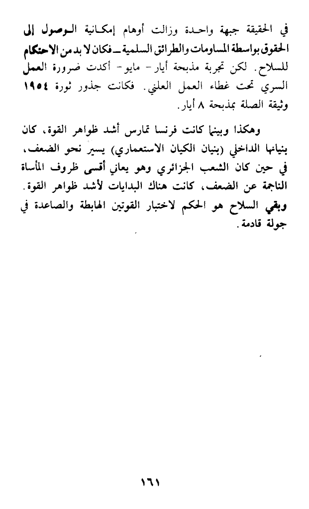 وهكذا وبينما كانت فرنسا تمارس أشد ظواهر القوة، كان بنيانها الداخلي (بنيان الكيان الاستعماري) يسير نحو الضعف، في حين كان الشعب الجزائري وهو يعاني أقسى ظروف المأساة الناجمة عن الضعف، كانت هناك البدايات لأشد ظواهر القوة. وبقي السلاح هو الحكم لاختبار القوتين الهابطة والصاعدة في جولة قادمة.