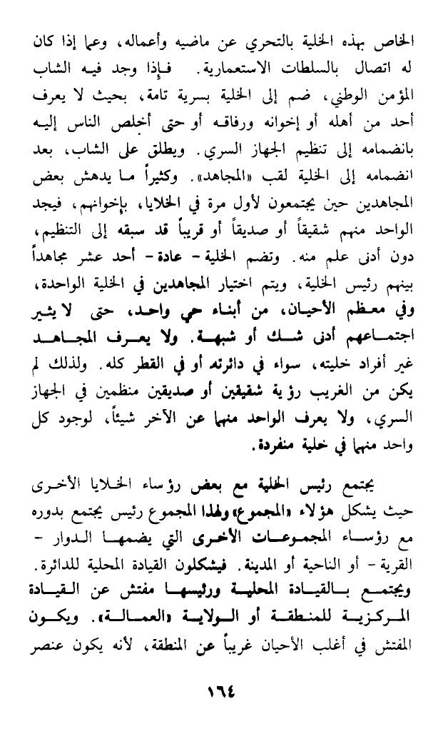 الخاص بهذه الخلية بالتحري عن ماضيه وأعماله، وعما إذا كان له اتصال بالسلطات الاستعمارية. فإذا وجد فيه الشاب المؤمن الوطني، ضم إلى الخلية بسريه تامة، بحيث لا يعرف أحد من أهله أو إخوانه ورفاقه أو حتى أخلص الناس إليه بانضمامه إلى تنظيم الجهاز السري. ويطلق على الشاب، بعد انضمامه إلى الخلية لقب (المجاهد). وكثيرا ما يدهش بعض المجاهدين حين يجتمعون لأول مرة في الخلايا، بإخوانهم، فيجد الواحد منهم شقيقا أو صديقا أو قريبا قد سبقه إلى التنظيم، دون أدنى علم منه. وتضم الخلية - عادة - أحد عشر مجاهدا بينهم رئيس الخلية، ويتم اختيار المجاهدين في الخلية الواحدة، وفي معظم الأحيان، من أبناء حي واحد، حتى لا يثير اجتماعهم أدنى شك أو شبهة. ولا يعرف المجاهد غير أفراد خليته، سواء في دائرته أو في القطر كله. ولذلك لم يكن من الغريب رؤية شقيقين أو صديقين منظمين في الجهاز السري، ولا يعرف الواحد منهما عن الآخر شيئا، لوجود كل واحد منهما في خلية منفردة.
