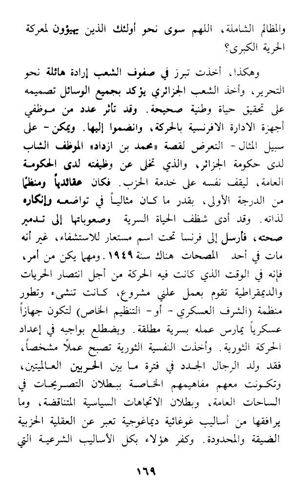 وهكذا، أخذت تبرز في صفوف الشعب إرادة هائلة نحو التحرير، وأخذ الشعب الجزائري يؤكد بجميع الوسائل تصميمه على تحقيق حياة وطنية صحيحة. وقد تأثر عدد من موظفي أجهزة الإدارة الإفرنسية بالحركة، وانضموا إليها. ويمكن - على سبيل المثال - التعرض لقصة , (محمد بن ازداد) الموظف الشاب لدى حكومة الجزائر، والذي تخلى عن وظيفته لدى الحكومة العامة، ليقف نفسه على خدمة الحزب. فكان عقائديا ومنظما من الدرجة الأولى، بقدر ما كان مثاليا في تواضعه وإنكاره لذاته. وقد أدى شظف الحياة السرية وصعوباتها إلى تدمير صحته، فأرسل إلى فرنسا تحت اسم مستعار للاستشفاء، غير أنه مات في أحد المصحات هناك سنة 1949. ومهما يكن من أمر، فإنه في الوقت الذي كانت فيه الحركة من أجل انتصار الحريات والديمقراطية تقوم بعمل علني مشروع، كانت تنشىء وتطور منظمة (الشرف العسكري - أو - التنظيم الخاص) لتكون جهازا عسكريا يمارس عمله بسرية مطلقة. ويضطلع بواجبه في إعداد الحركة الثورية. وأخذت النفسية الثورية تصبح عملا مشخصا، فقد ولد الرجال الجدد في فترة ما بين الحربين العالميتين، وتكونت معهم مفاهيمهم الخاصة ببطلان التصريحات في الساحات العامة، وبطلان الاتجاهات السياسية المتناقضة، وما يرافقها من أساليب غوغائية ديماغوجية تعبر عن العقلية الحزبية الضيقة والمحدودة. وكفر هؤلاء بكل الأساليب الشرعية التي