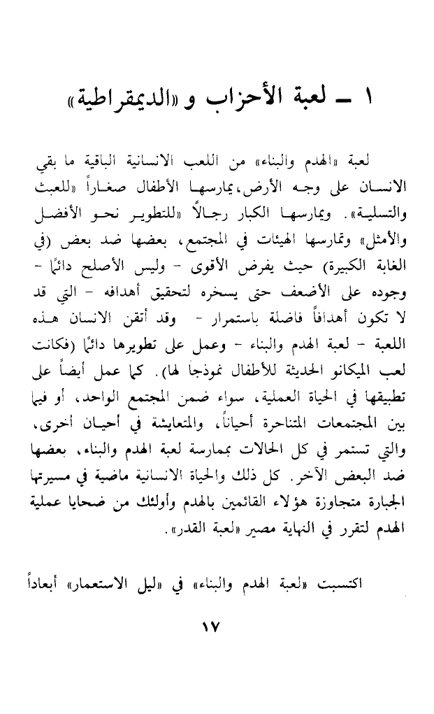 لعبة (الهدم والبناء) من اللعب الإنسانية الباقية ما بقي الإنسان على وجه الأرض، يمارسها الأطفال صغارا (للعبث والتسلية). ويمارسها الكبار رجالا (للتطوير نحو الأفضل والأمثل) وتمارسها الهيئات في المجتمع، بعضها ضد بعض (في الغابة الكبيرة) حيث يفرض الأقوى - وليس الأصلح دائما - وجوده على الأضعف حتى يسخره لتحقيق أهدافه - التي قد لا تكون أهدافا فاصلة باستمرار وقد أتقن الإنسان هذه اللعبة - لعبة الهدم والبناء - وعمل على تطويرها دائما (فكانت لعب الميكانو الحديثة للأطفال نموذجا لها). كما عمل أيضا على تطبيقها في الحياة العملية، سواء ضمن المجتمع الواحد، أو فيما بين المجتمعات المتناحرة أحيانا، والمتعايشة في أحيان أخرى، والتي تستمر في كل الحالات بممارسة لعبة الهدم والبناء، بعضها ضد البعض الآخر. كل ذلك والحياة الإنسانية ماضية في مسيرتها الجبارة متجاوزة هؤلاء القائمين بالهدم وأولئك من ضحايا عملية الهدم لتقرر في النهاية مصير (لعبة القدر).