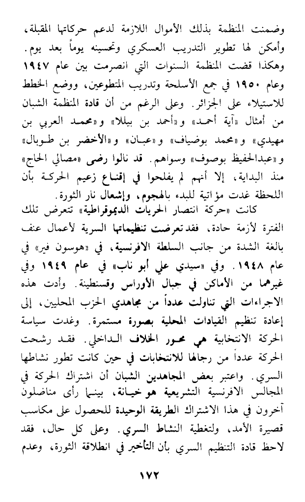 وضمنت المنظمة بذلك الأموال اللازمة لدعم حركاتها المقبلة، وأمكن لها تطوير التدريب العسكري وتحسينه يوما بعد يوم. وهكذا قضت المنظمة السنوات التي انصرمت بين عام 1947 وعام 1950 في جمع الأسلحة وتدريب المتطوعين، ووضع الخطط للاستيلاء على الجزائر. وعلى الرغم من أن قادة المنظمة الشبان من أمثال (آية أحمد) و (أحمد بن بيللا) و (محمد العربي بن مهيدي) و (محمد بوضياف) و (عبان) و (الأخضر بن طوبال) و (عبد الحفيظ بوصوف) وسواهم. قد نالوا رضى (مصالي الحاج) منذ البداية، إلا أنهم لم يفلحوا في إقناع زعيم الحركة بأن اللحظة غدت مؤاتية للبدء بالهجوم، وإشعال نار الثورة.