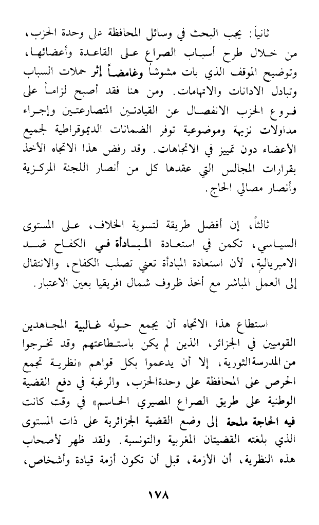 ثانيا: يجب البحث في وسائل المحافظة على وحدة الحزب، من خلال طرح أسباب الصراع على القاعدة وأعضائها، وتوضيح الموقف الذي بات مشوشا وغامضا إثر حملات السباب وتبادل الإدانات والاتهامات. ومن هنا فقد أصبح لزاما على فروع الحزب الانفصال عن القيادتين المتصارعتين وإجراء مداولات نزيهة وموضوعية توفر الضمانات الديموقراطية لجميع الأعضاء دون تمييز في الاتجاهات. وقد رفض هذا الاتجاه الأخذ بقرارات المجالس التي عقدها كل من أنصار اللجنة المركزية وأنصار مصالي الحاج.