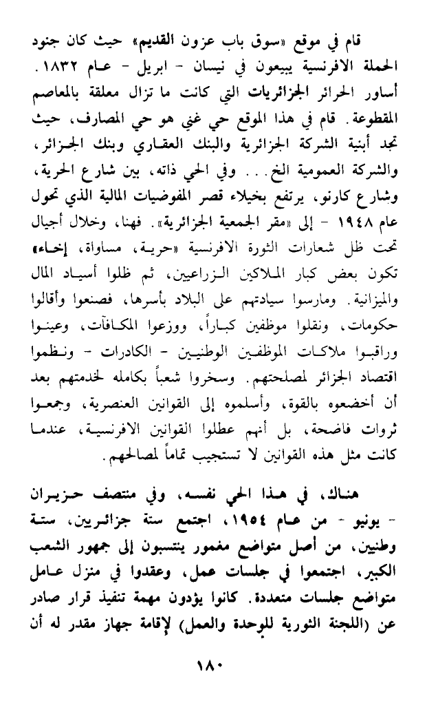 قام في موقع (سوق باب عزون القديم، حيث كان جنود الحملة الافرنسية يبيعون في نيسان - ابريل - عام 1832. أساور الحرائر الجزائريات التي كانت ما تزال معلقة بالمعاصم المقطوعة. قام في هذا الموقع حي غني هو حي المصارف، حيث تجد أبنية الشركة الجزائرية والبنك العقاري وبنك الجزائر، والشركة العمومية الخ ... وفي الحي ذاته، بين شارع الحرية، وشارع كارنو، يرتفع بخيلاء قصر المفوضيات المالية الذي تحول عام 1948 - إلى (مقر الجمعية الجزائرية). فهنا، وخلال أجيال تحت ظل شعارات الثورة الإفرنسية (حرية، مساواة، إخاء) تكون بعض كبار الملاكين الزراعيين، ثم ظلوا أسياد المال والميزانية. ومارسوا سيادتهم على البلاد بأسرها، فصنعوا وأقالوا حكومات، ونقلوا موظفين كبارا، ووزعوا المكافآت، وعينوا وراقبوا ملاكات الموظفين الوطنيين - الكادرات - ونظموا اقتصاد الجزائر لمصلحتهم. وسخروا شعبا بكامله لخدمتهم بعد أن أخضعوه بالقوة، وأسلموه إلى القوانين العنصرية، وجمعوا ثروات فاضحة، بل أنهم عطلوا القوانين الإفرنسية، عندما كانت مثل هذه القوانين لا تستجيب تماما لمصالحهم.