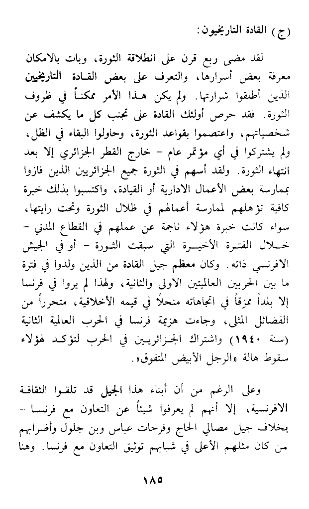 لقد مضى ربع قرن على انطلاقة الثورة، وبات بالامكان معرفة بعض أسرارها، والتعرف على بعض القادة التاريخيين الذين أطلقوا شرارتها. ولم يكن هذا الأمر ممكنا في ظروف الثورة. فقد حرص أولئك القادة على تجنب كل ما يكشف عن شخصياتهم، واعتصموا بقواعد الثورة، وحاولوا البقاء في الظل، ولم يشتركوا في أي مؤتمر عام - خارج القطر الجزائري إلا بعد انتهاء الثورة. ولقد أسهم في الثورة جميع الجزائريين الذين فازوا بممارسة بعض الأعمال الادارية أو القيادة، واكتسبوا بذلك خبرة كافية تؤهلهم لممارسة أعمالهم في ظلال الثورة وتحت رايتها، سواء كانت خبرة هؤلاء ناجمة عن عملهم في القطاع المدني - خلال الفترة الأخيرة التي سبقت الثورة - أو في الجيش الإفرنسي ذاته. وكان معظم جيل القادة من الذين ولدوا في فترة ما بين الحربين العالميتين الأولى والثانية، ولهذا لم يروا في فرنسا إلا بلدا ممزقا في اتجاهاته منحلا في قيمه الأخلاقية، متحررا من الفضائل المثلى، وجاءت هزيمة فرنسا في الحرب العالمية الثانية (سنة 1940) واشتراك الجزائريين في الحرب لتؤكد لهؤلاء سقوط هالة (الرجل الأبيض المتفوق).