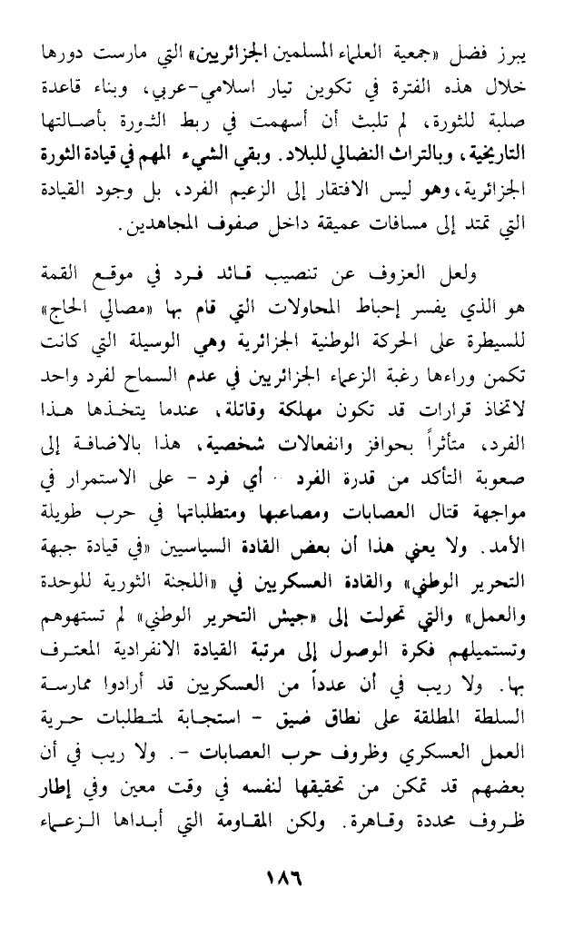 ولعل العزوف عن تنصيب قائد فرد في موقع القمة هو الذي يفسر إحباط المحاولات التي قام بها (مصالي الحاج) للسيطرة على الحركة الوطنية الجزائرية وهي الوسيلة التي كانت تكمن وراءها رغبة الزعماء الجزائريين في عدم السماح لفرد واحد لاتخاذ قرارات قد تكون مهلكة وقاتلة، عندما يتخذها هذا الفرد، متأثرا بحوافز وانفعالات شخصية، هذا بالاضافة إلى صعوبة التأكد من قدرة الفرد، أي فرد - على الاستمرار في مواجهة قتال العصابات ومصاعبها ومتطلباتها في حرب طويلة الأمد. ولا يعني هذا أن بعض القادة السياسيين (في قيادة جبهة التحرير الوطني) والقادة العسكريين في (اللجنة الثورية للوحدة والعمل) والتي تحولت إلى (جيش التحرير الوطني) لم تستهوهم وتستميلهم فكرة الوصول إلى مرتبة القيادة الانفرادية المعترف بها. ولا ريب في أن عددا من العسكريين قد أرادوا ممارسة السلطة المطلقة على نطاق ضيق - استجابة لمتطلبات حرية العمل العسكري وظروف حرب العصابات -. ولا ريب في أن بعضهم قد تمكن من تحقيقها لنفسه في وقت معين وفي إطار