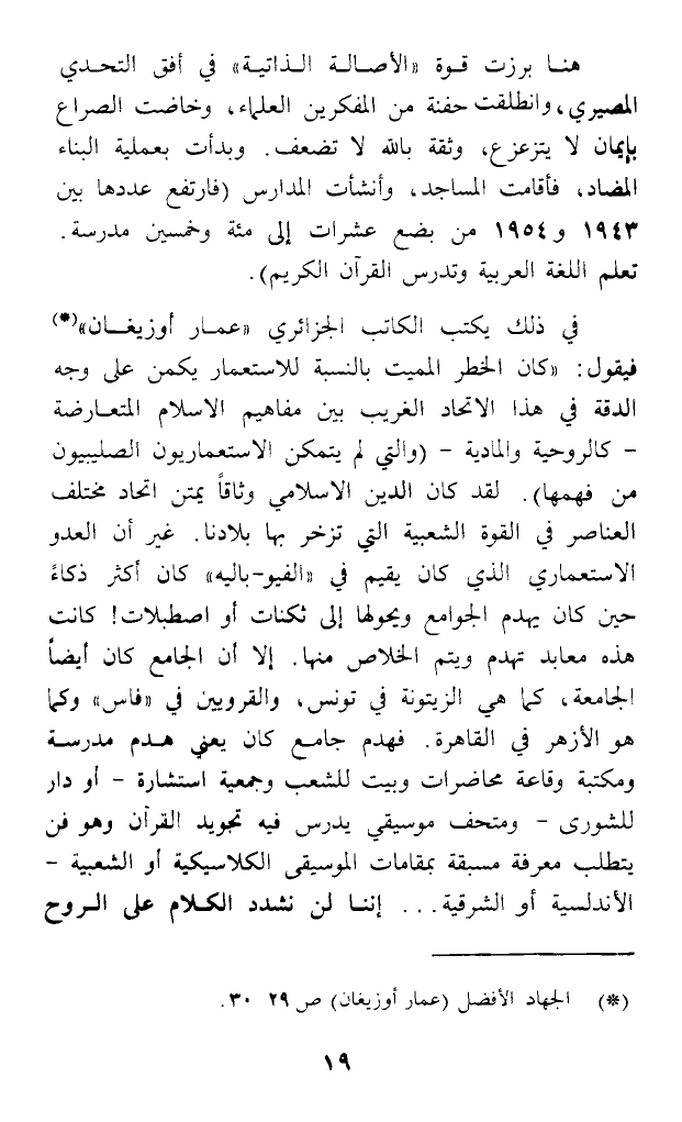 في ذلك يكتب الكاتب الجزائري (عمار أوزيغان) (*) فيقول: (كان الخطر المميت بالنسبة للاستعمار يكمن على وجه الدقة في هذا الاتحاد الغريب بين مفاهيم الإسلام المتعارضة - كالروحية والمادية - (والتي لم يتمكن الاستعماريون الصليبيون من فهمها). لقد كان الدين الإسلامي وثاقا يمتن اتحاد مختلف العناصر في القوة الشعبية التي تزخر بها بلادنا. غير أن العدو الاستعماري الذي كان يقيم في (الفيو - باليه) كان أكثر ذكاء حين كان يهدم الجوامع ويحولها إلى ثكنات أو اصطبلات! كانت هذه معابد تهدم ويتم الخلاص منها. إلا أن الجامع كان أيضا الجامعة، كما هي الزيتونة في تونس، والقرويين في (فاس) وكما هو الأزهر في القاهرة. فهدم جامع كان يعني هدم مدرسة ومكتبة وقاعة محاضرات وبيت للشعب وجمعية استشارة - أو دار للشورى - ومتحف موسقي يدرس فيه تجويد القرآن وهو فن يتطلب معرفة مسبقة بمقامات الموسيقى الكلاسيكية أو الشعبية - الأندلسية أو الشرقية ... إننا لن نشدد الكلام على الروح