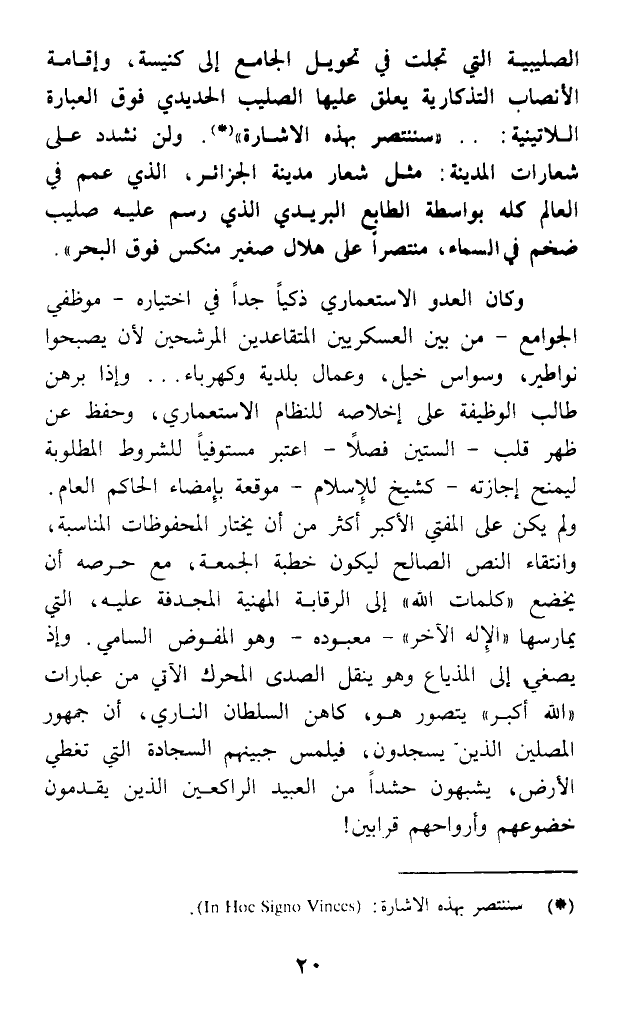 الصليبية التي تجلت في تحويل الجامع إلى كنيسة، وإقامة الأنصاب التذكارية يعلق عليها الصليب الحديدي فوق العبارة اللاتينية: .. (سننتصر بهذه الإشارة) (*). ولن نشدد على شعارات المدينة: مثل شعار مدينة الجزائر، الذي عمم في العالم كله بواسطة الطابع البريدي الذي رسم عليه صليب ضخم في السماء، منتصرا على هلال صغير منكس فوق البحر).